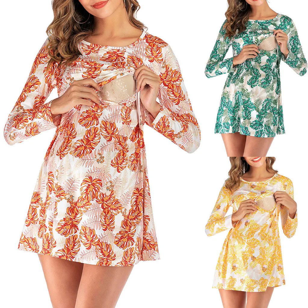 Женское короткое платье с круглым вырезом и длинными рукавами для беременных