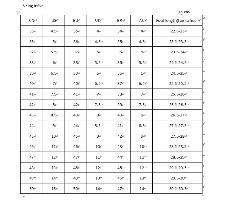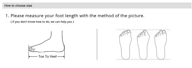 Подсказка: Пожалуйста, выбирайте размер в соответствии с длиной Вашей стопы (от носка до пятки) и таблицей размеров. Спасибо!