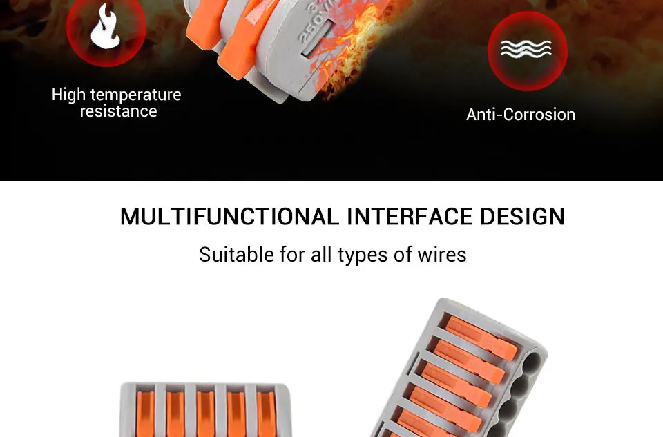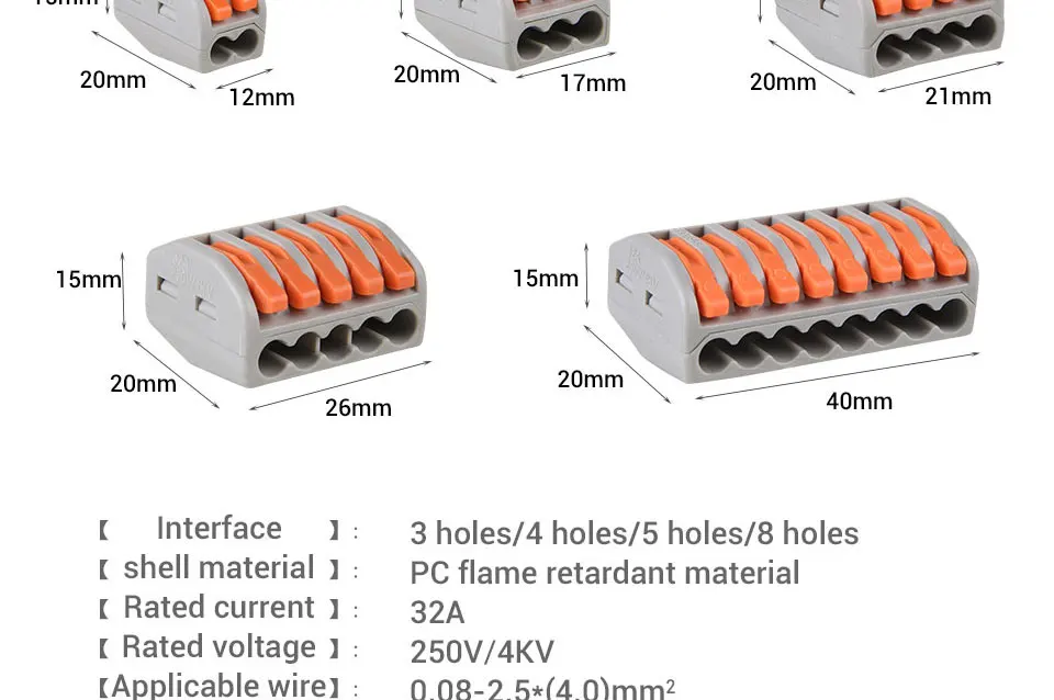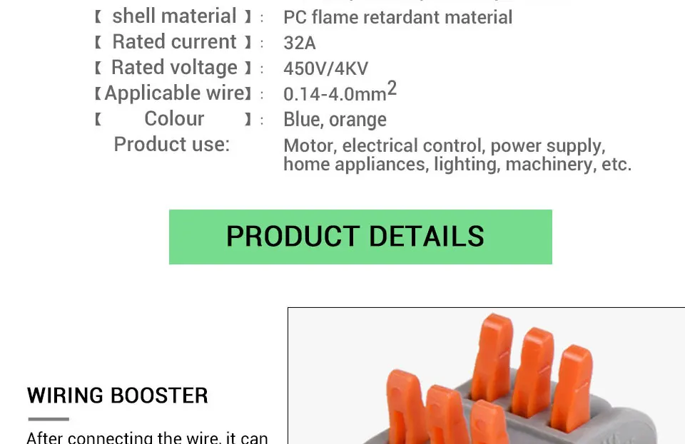 Особенности: 100% новый товар высокого качества. Широко используется-он широко используется в строительстве проводки, где пространство является премиум для всех соединений, требующих. Безопасный-выбор лучшего огнезащитного изоляционного материала, который является долгим сроком службы, без коррозии, анти-старения, давления 4КВ и от электрического удара. Простота в использовании-вместо традиционного способа стыковки проводов. Это нарушает недостатки традиционного способа проводки, который является хлопотным в проводке, легко протекает, и Легко подвергается коррозии. Многоразовый-Этот соединитель провода подходит для мягкого и жесткого провода. Каждый стык независимый шрапнель, различные провода управляются отдельно, различный диаметр может быть Подключение безопасности, есть тестовое отверстие в каждой поверхности клетки, Электрический тест не нужно снимать ленту, интуитивно понятный, более легкий, более того, это многоразовый разъем. Спецификация: Название продукта: Универсальный проводной разъем Номер модели: PCT212,PCT213,PCT214,PCT215.PCT218.PCT222.PCT223.PCT412.PCT413.PCT414.PCT415 Материал утеплителя: модифицированный нейлон (PA66) Материал контакта: Фосфорная медь Сечение провода: 0,08 ~ 2,5 мм2 (один жесткий провод); 0,08 ~ 4 мм2 (мульти мягкий провод) Цвет: серый + оранжевый Номинальный ток: 32A Номинальное напряжение: 250 в 450 в Номинальное импульсное напряжение: 4 кВ Номинальная мощность: 8KW Калибр: 28 ~ 12AWG Длина ленты: 9 - 10 мм