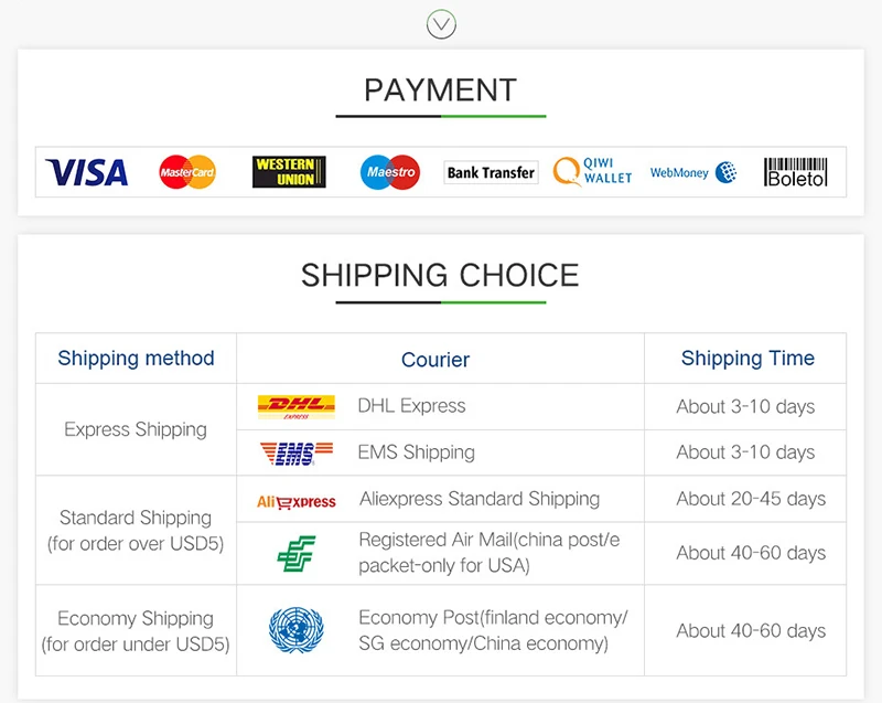 1. Доставка по всему миру. (За исключением некоторых стран и армейской почтовой службы/почтовых отделений флота) 2. Заказы обрабатываются своевременно после подтверждения оплаты. 3. Мы отправляем только по подтвержденным адресам заказа. Ваш адрес заказа должен совпадать с вашим адресом доставки. 4. Время доставки определяется перевозчиком и не включает выходные и праздничные дни. Сроки доставки могут меняться, особенно во время курортного сезона. 5. Если вы не получили посылку в течение 30 дней с момента оплаты, пожалуйста, свяжитесь с нами. Мы отследим отправку и свяжемся с вами как можно скорее. Наша цель – удовлетворение клиентов! 6. Импортные пошлины, налоги и сборы, понесенные в стране покупателя, не включены в цену товара или стоимость доставки. Эти расходы являются обязанностью покупателя. 7. Из-за наличия на складе и разницы во времени, мы выберем доставку Вашего товара с нашего первого доступного склада для быстрой доставки.