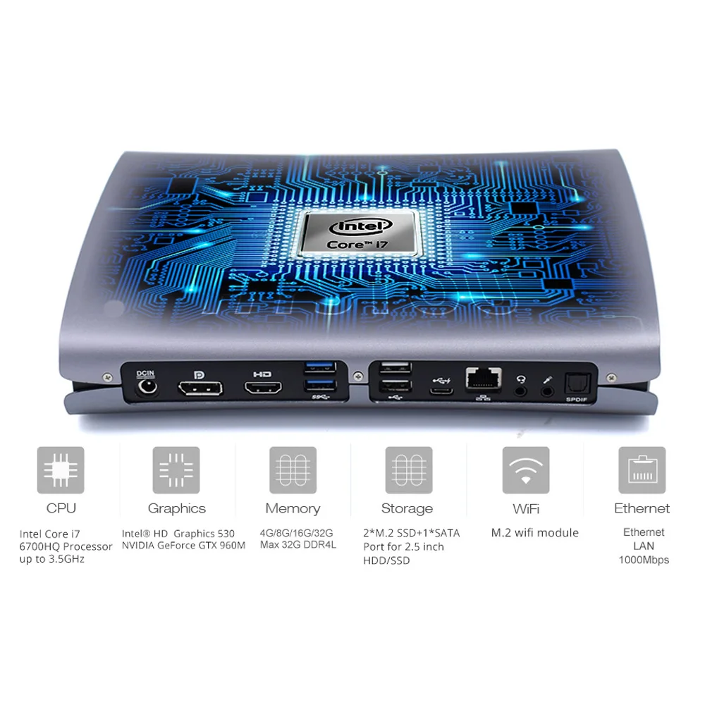 1. Встроенные процессоры Intel Core i7 6-го поколения, для офиса, домашнего развлечения, промышленного управления, игрового компьютера! 2. Поддержка Windows 7,Windows 8, Windows 10, Linux; 3. Sup Порты и разъёмы двойной DDR4L 4G/8G/16G/32G Макс 32 GB оперативная память, 2xM.2 SSD 1xsata Порты и разъёмы для 2,5 дюйма SSD или HDD; 4. Поддерживает двойной дисплей HD; 5. Включает 1 * HDMI 1 * DP 1 * гигабитный Ethernet 4 * USB 3,0 2 * USB2.0 1 * USB порт Type-C 1 * аудиовход 1 * аудиовыход 1 * порт S/PDIF выключатель + 1*19 В постоянного тока 6. Поддержка 802,11. b/g/n (150m или 300m опционально, с Bluetooth) 7. Корпус из алюминиевого сплава, встроенный вентилятор охлаждения; 8. Поддерживает синхронный дифференциал, Intel®HD graphics 530 core, NVIDIA geforce GTX 960m, независимая, двойной дисплей;