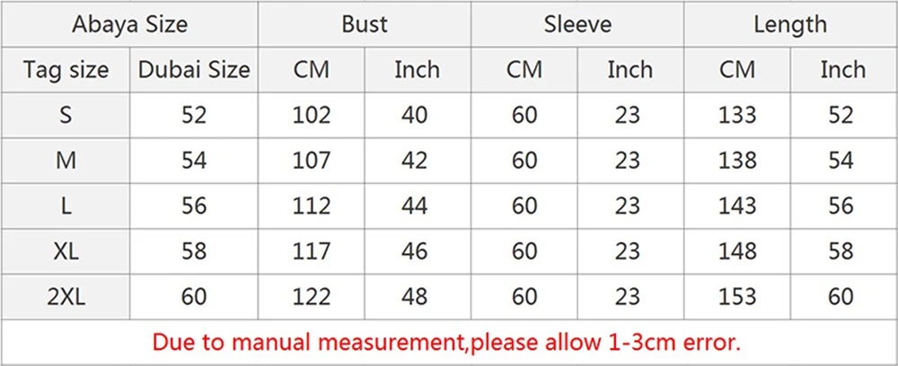 S: Дубай размер 52 см, бюст 102 см, рукав 60 см, длина 133 см M: Дубай размер 54 см, бюст 107 см, рукав 60 см, длина 138 см L: Дубай размер 56 см, бюст 112 см, рукав 60 см, длина 143 см XL: Дубай размер 58 см, бюст 117 см, рукав 60 см, длина 148 см 2XL: Дубай размер 60 см, бюст 122 см, рукав 60 см, длина 153 см