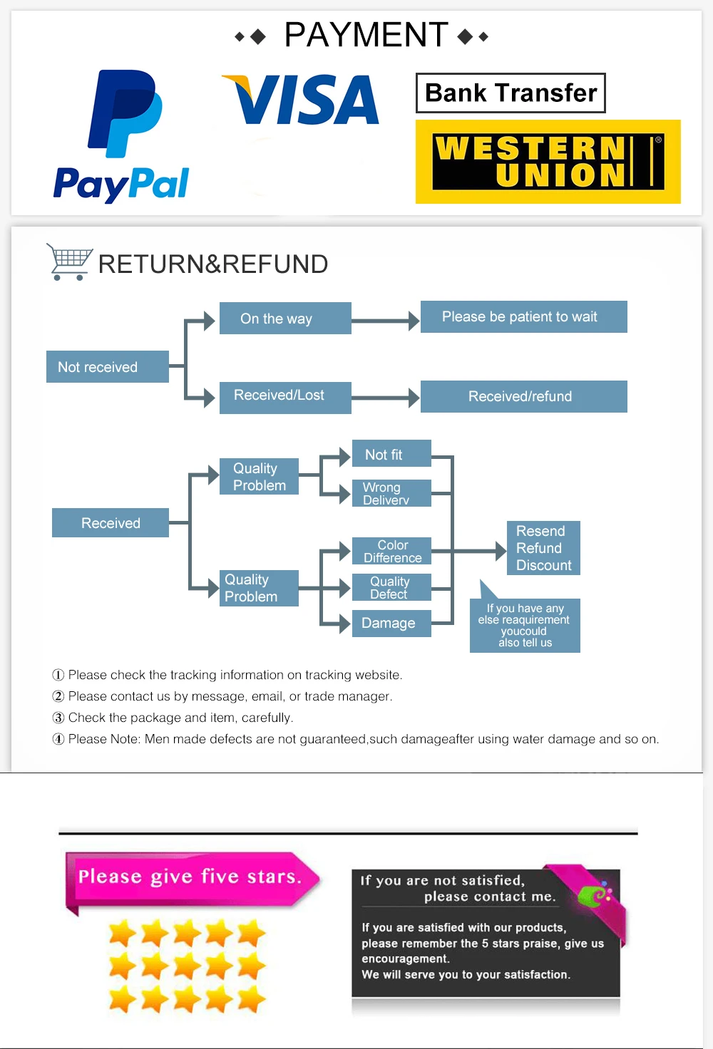 1. Почему российским покупателям нужно полное имя? В связи с корректировкой почтовой политики России, покупателям необходимо указать свое полное имя (имя, отцов, фамилию), чтобы они могли расписаться за посылку. 2. Есть ли скидка на оптовый заказ? Да, мы можем предоставить оптовые цены. Мы предложим скидку или бесплатную Экспресс-доставку, которая займет всего 3-7 дней. 3. Поддерживаете ли вы прямые поставки? Да, мы работаем с прямыми поставками. То, что вы оставите нам получателя, адрес и номер телефона на Aliexpress в тех случаях, когда вы заказываете, то, пожалуйста, обратите внимание: Мы отправим посылка в зависимости на тот адрес, который вы имеете слева. 4. Как я могу отследить свою посылку? Вы можете отследить свою посылку на следующем веб-сайте, используя свой номер для отслеживания: www.17track.net/en (скопируйте ее в браузере, чтобы открыть) 5. Что я могу сделать, когда время защиты покупки закончилось? Если срок защиты заказа истекает, свяжитесь с нами, и мы поможем его продлить. Поэтому ваши деньги не поступят на мой счет. 6. О доставке: (1) мы организуем доставку в соответствии с предоставленным покупателем адресом, поэтому, пожалуйста, подтвердите и проверьте адресные реквизиты, прежде чем разместить заказ. (2) Если вы не получили товар в течение 60 дней, пожалуйста, свяжитесь с нами напрямую. Мы проверим его и свяжемся с вами. Если у вас есть какие-либо вопросы по продукту или нашему сервису, пожалуйста, свяжитесь с нами, прежде чем оставить отрицательный отзывы. Мы сделаем все возможное, чтобы решить любые вопросы и предоставить Вам лучшее обслуживание клиентов.