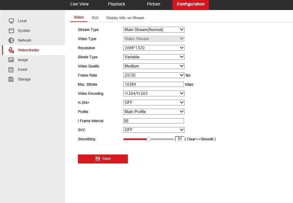 | Main Stream | 50 Hz: 25 fps (2688 × 1520, 1920 × 1080, 1280 × 720) 60 Hz: 30 fps (2688 × 1520, 1920 × 1080, 1280 × 720) |