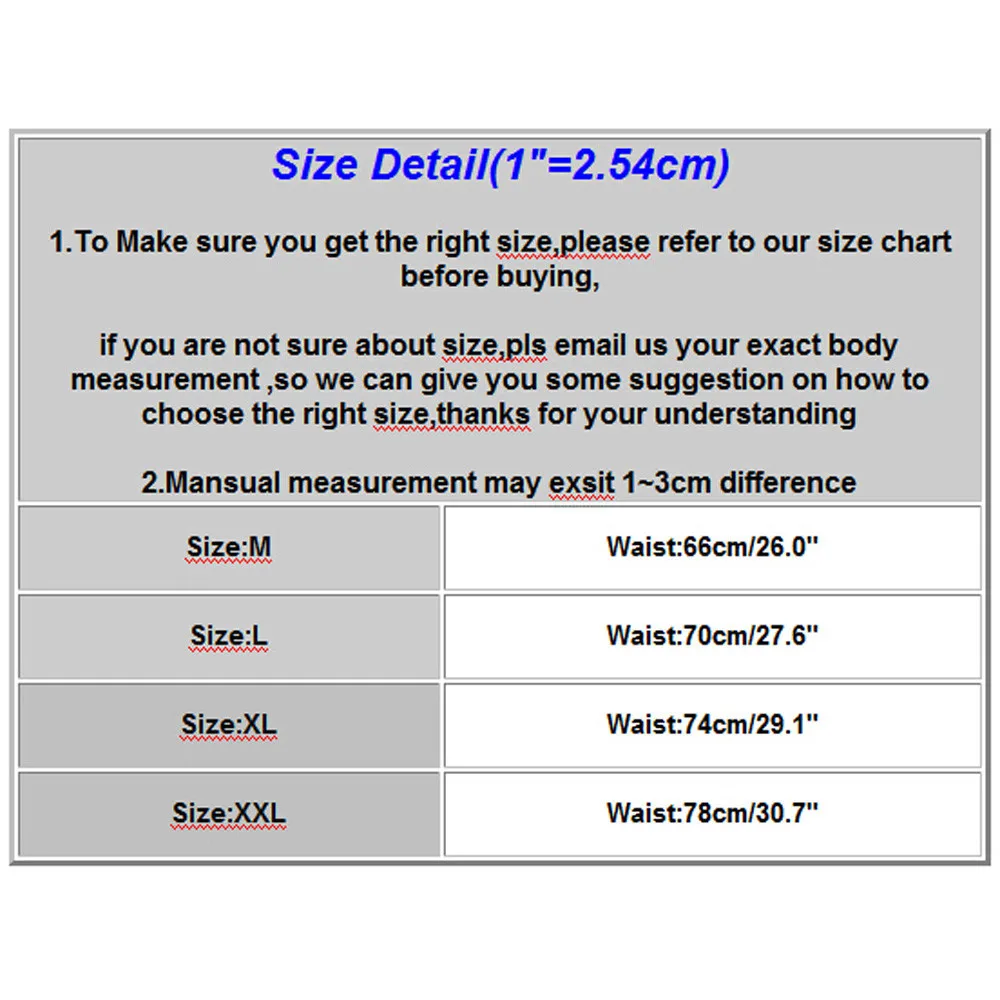 Деталь размера (1 дюйм = 2,54 см) 1. Чтобы убедиться, что вы получили правильный Размер, пожалуйста, ознакомьтесь с нашей таблицей размеров перед покупкой, Если вы не уверены в Размер, пожалуйста, напишите нам ваше точное измерение тела, чтобы мы могли дать вам некоторые Предложение о том, как выбрать правильный размер, спасибо за понимание 2. Ручное измерение может отличаться Разница 1 ~ 3 см |