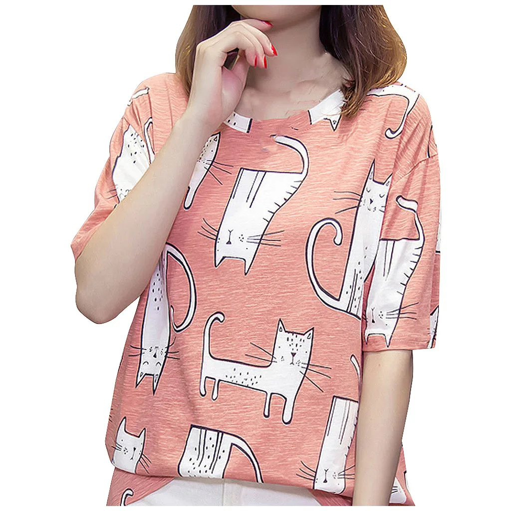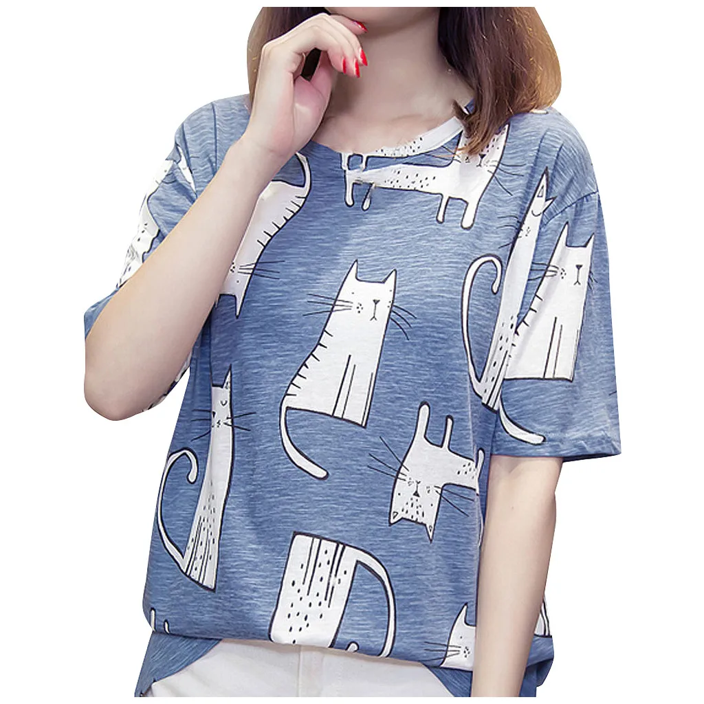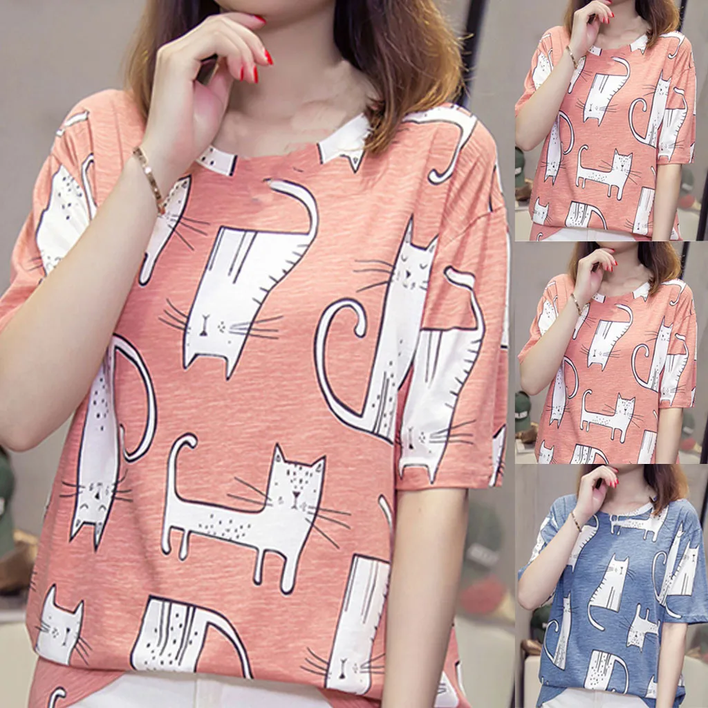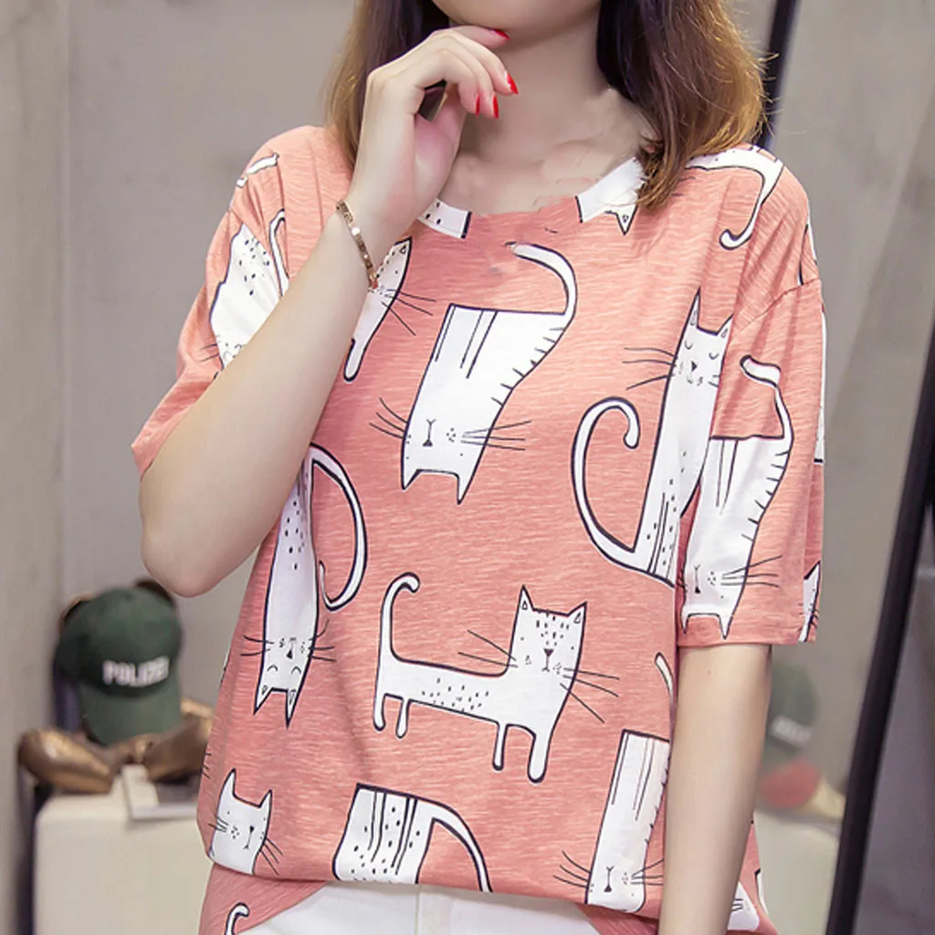 Мода женщин печати размера плюс сплошной цвет короткий рукав футболки Блузка