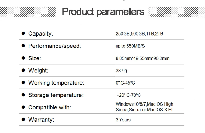 Detalles del producto Capacidad de los parámetros: 250GB 500 GB, 1 TB, Rendimiento/velocidad: velocidad de lectura de hasta 550 MB/S Tamaño del producto: 8,85mm x 49,55mm x 96,2mm (HxWxL) Peso del producto: 78,9g Temperatura de funcionamiento: 0 a 45 grados Temperatura de almacenamiento:-20 grados a 70 grados Compatible con: Windows 10, Windows 8,1, Windows 7 Mac OS alta Sierra Mac OS X EI Capitan Posventa: 3 años de garantía Velocidad de lectura de hasta 550 MB/S Sandisk velocidad™La SSD móvil ofrece transferencias de alto rendimiento con velocidades de lectura de hasta 550 MB/**, lo que te permite mover archivos rápidamente. Capacidad de hasta 2 TB Con hasta 2 TB de almacenamiento de alta velocidad, el sandisk Velocidad máxima™La unidad móvil de estado sólido es ideal para almacenar fotos, vídeos y archivos de audio de alta resolución para una variedad de actividades creativas. El diseño de la forma es delicado y pequeño, solo tamaño de bolsillo. Las cosas buenas no son grandes, aunque son más pequeñas que un smartphone, la velocidad máxima de sandisk™La unidad móvil de estado sólido ofrece un rendimiento y una capacidad superiores.