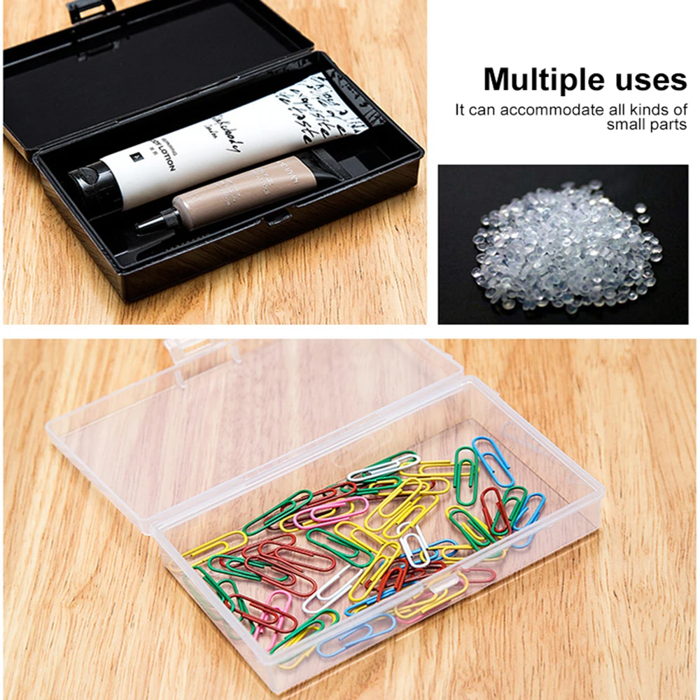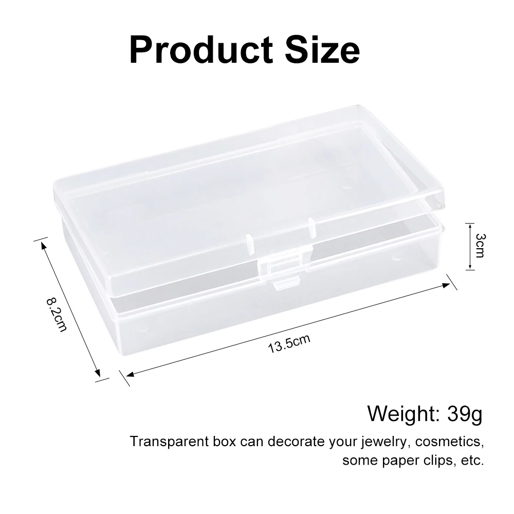 Размеры: 13,5x8,2x3 см/9 × 6 × 3 см Нескользящие и износостойкие: 4 выпуклости в нижней части коробки для защиты коробки, которые не скользят и износостойкие Многократное использование: прозрачная коробка может держать ваши ювелирные изделия, бусины, некоторые скрепки и так далее