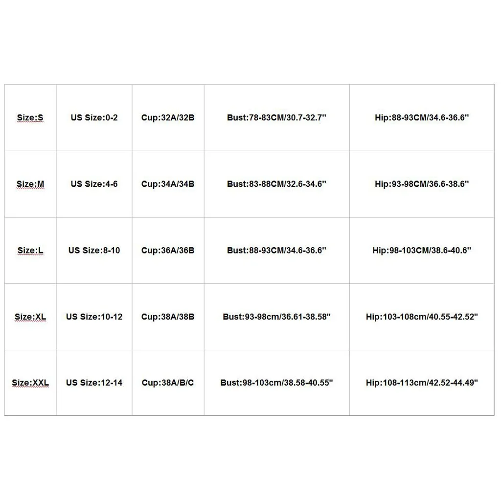 | Size:S | US Size:0-2 | Cup:32A/32B | Bust:78-83CM/30.7-32.7" | Hip:88-93CM/34.6-36.6" |