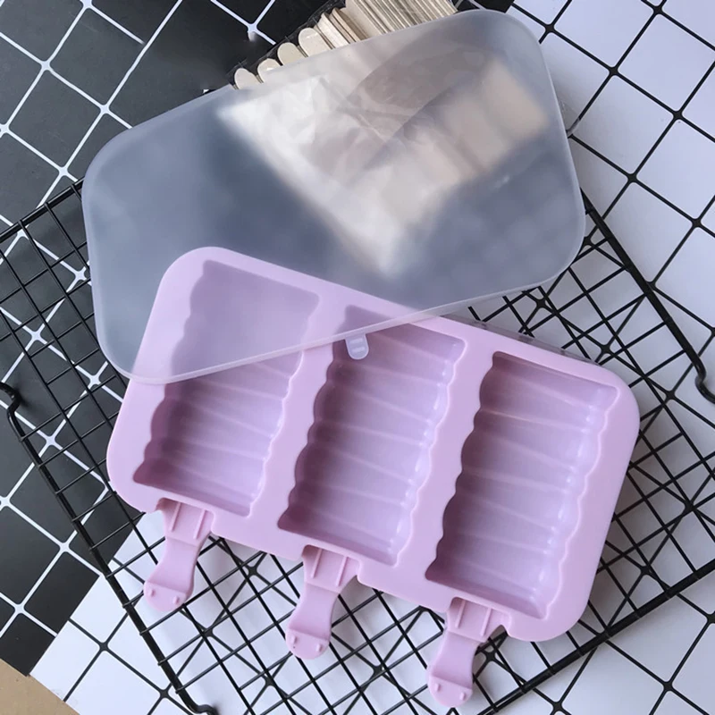 <Многоразовому использованию: мороженое бар формы поставляются с 3-ех полости прессформа эскимо и 50 шт. палочек для фруктового мороженного, используется для много раз, прочный и гибкий, он не будет треснутых или выветрится.