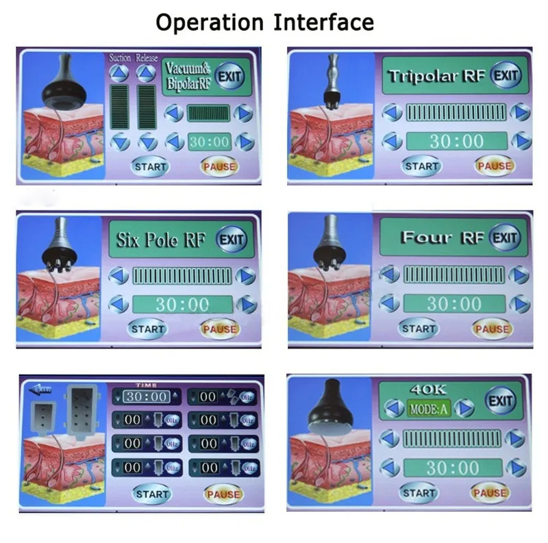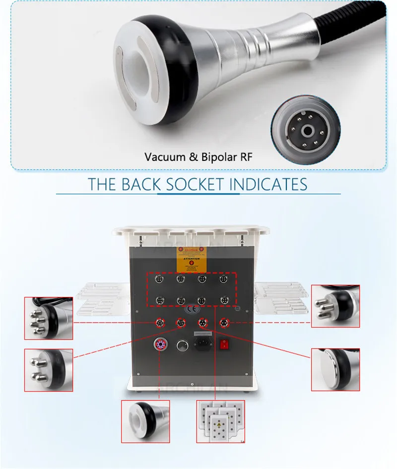 With a collective strong sound wave head, that emitts a sound wave of 40000HZ vibrates the fat cells at the highestv speed and can then produce numerous vacuum air pockets inside and outside the fat cells, This robust action impacts on the fat cells and generates an introverted blast to disintegrate triglyceride into glycerol and free fatty acids. Then the RF waves at a frequency of 1MHZ are used for exhausting the integrated glycerol and free fatty acids through hepatoenteral circulation. Finally, vacuum RF and energy electrodes are used for positioning and tightening fat. This is known as "cavitation". Micropore introverted blasts inside and outside the cells may lead to enhanced molecular motion and a higher energy level and this will finally cause the fat cells to rupture and thereby achieve the effects of body building and losing weight.