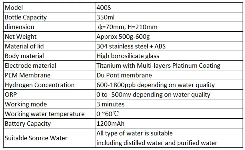 В любом месте, в любое время, наслаждайтесь бутылкой пресной водородной воды на 3 минуты 400 S водородная бутылка для воды имеет следующие преимущества: 1: эстетический дизайн, красивый 2. Du Pont Протон обмен мембраны, создать чистый водород 3. Импортированный титан с 7-слойным платиновым покрытием. 4. Водород макс до 600-1800 ppb и ORP макс до-500 мВ ORP 5. Нет предела источника воды, даже дистиллированная вода и очищенная вода могут быть использованы. 6. Конструкция двойного назначения, совместима с пластиковыми бутылками с узким местом диаметром 26 мм Особенности: 1: 3 минуты рабочего времени, быстро получить водородную воду 2. Нажмите кнопку, чтобы управлять устройством, прост в использовании. 3. Работает с ПЭТ-бутылками с узким местом диаметром 26 мм 4. Пищевой АБС-материал, здоровый и безопасный 5: Двухслойное боросиликатное стекло 6. Approx.300 мл емкость воды, лучше всего для питья в одно время Как активировать PEM мембрану в первый раз: После получения устройства, пожалуйста, налейте немного воды в бутылку перед запуском устройства и дайте мембране замочить воду 5-10 часов для активации мембраны, в противном случае, устройство создает небольшое количество пузырьков во время бега, если мембрана не замачивает достаточное количество воды. Мы предлагаем всегда оставлять небольшое количество воды внутри бутылки, чтобы держать мембрану влажной.
