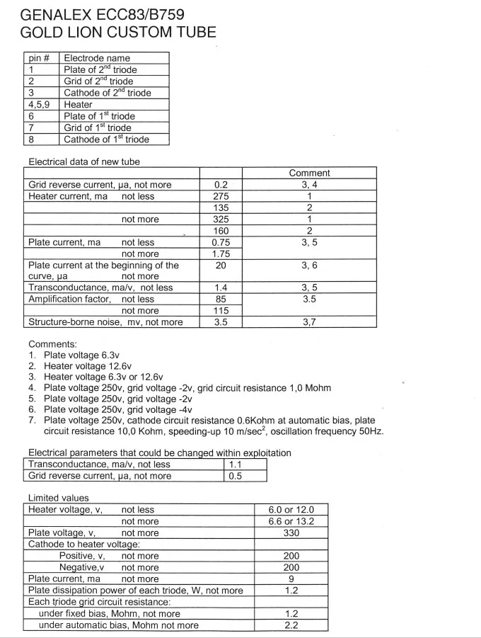 Оригинальные трубки Genalex Gold Lion ECC83/B759/12AX7 считаются одними из лучших типов труб 12AX7. Их трудно найти, и когда они доступны, они стоят дорого. Они демонстрируют большую детальную звуковую сцену, которая востребована discerning audiophiles, которые требуют высочайшего качества звука. Новый выпуск Genalex Gold Lion ECC83 / B759 / 12AX7 воссоздает звуковую подпись оригинала. Эта трубка имеет сбалансированные секции и позолоченные булавки.