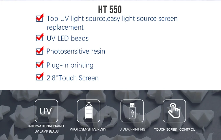 HT550-это 3D-принтер с ЖК-дисплеем, который специально разработан для обеспечения высокого качества и улучшенной производительности в стоматологических, образовательных, домашних, ремесленных и относительных областях.