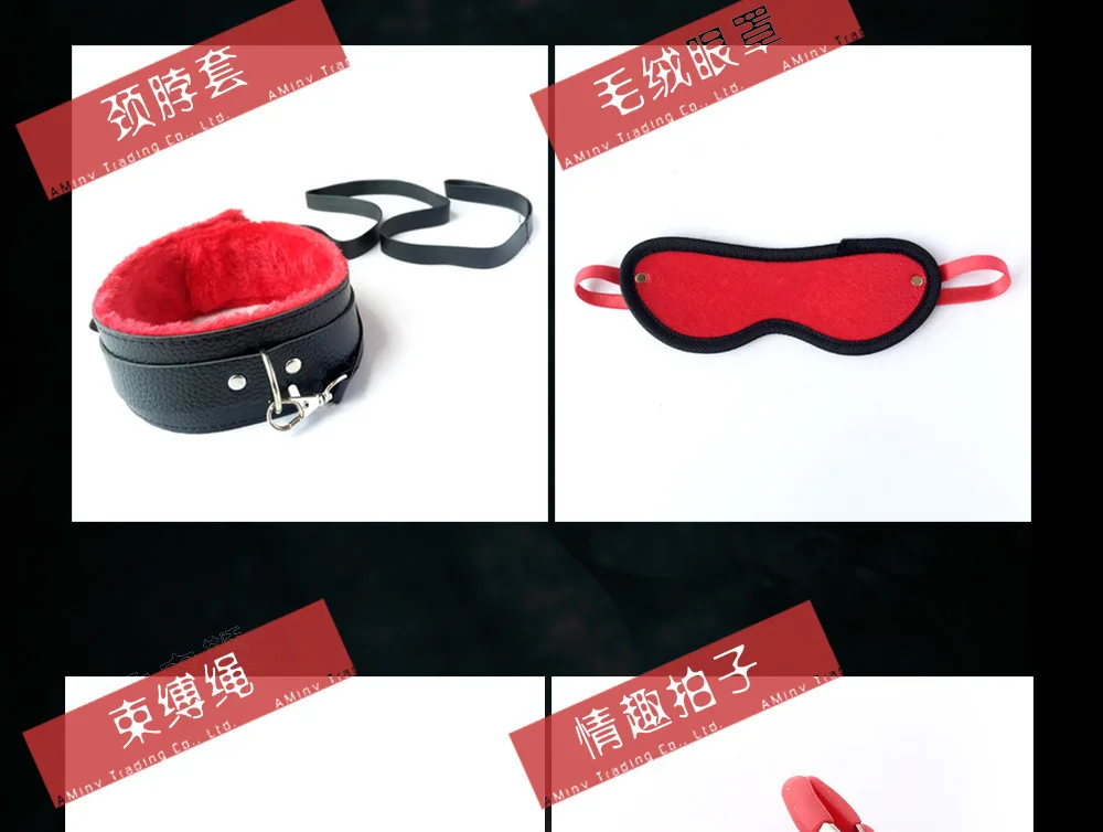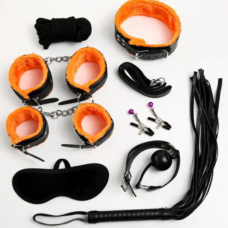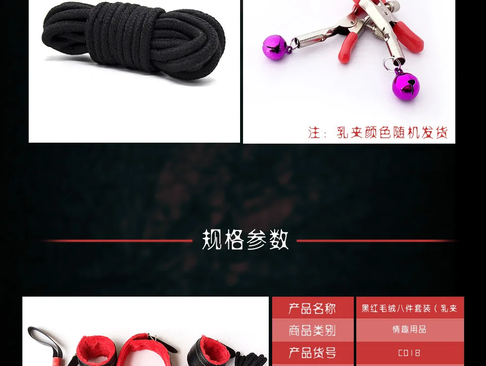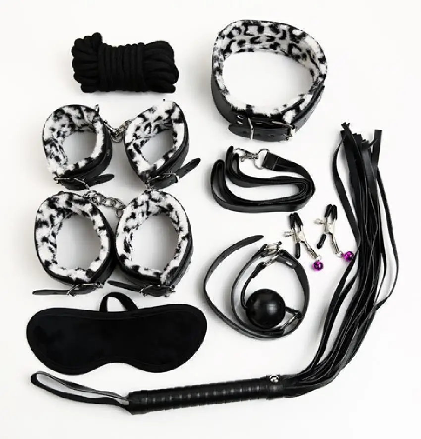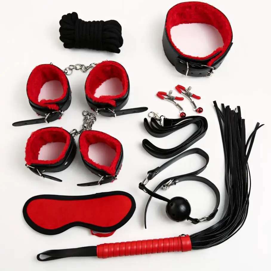 Set includes: handcuffs, footcuffs, neck, nipple, whip, eye mask, mouth ball, 5m cotton rope
