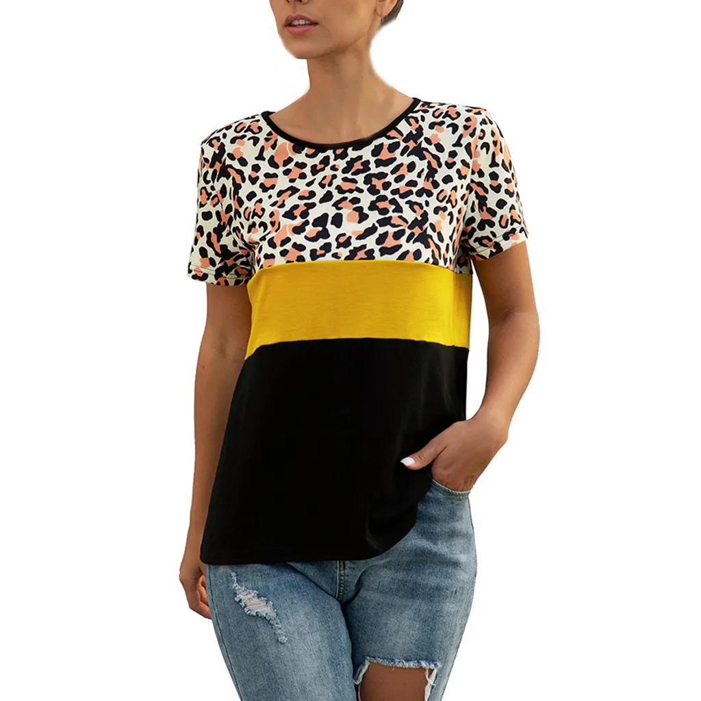 3. Круглый вырез,КороткийРукав,Затяните на застежке,Разноцветная Лоскутная одежда с леопардовым принтом.Простой, но модный. Тонкий и подходящий.