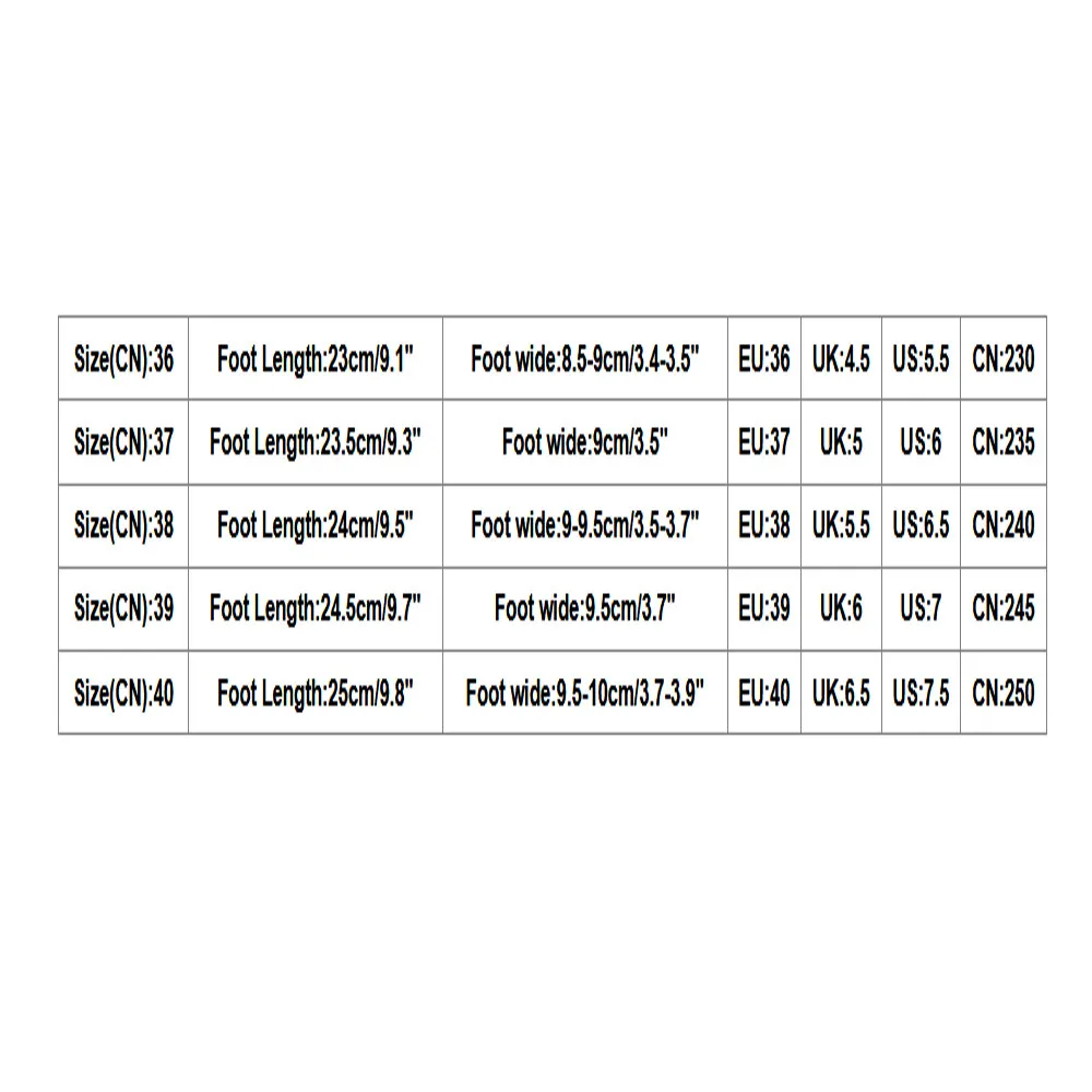 Посылка: 1 пара обуви(Не включая коробку для обуви)Размер Длина стопы Широкая стопа CN ЕС Великобритания США 36 23 см/9,1" 8,5-9 см/3,4-3,5 "" 230/36 36 4,5 5,5 37 23,5 см/9,3 дюйма 9 см/3,5 дюйма 235/37 37 5 6 38 24 см/9,5 дюйма 9-9,5 см/3,5-3,7 дюйма 240/38 38 5,5 6,6 39 24,5 см/9,7 дюйма 9,5 см/3,7 дюйма 245/39 39 6 7 40 25 см/9,8 дюйма 9,5-10 см/3,7-3,9 дюйма 250/40 40 6,5 7,5