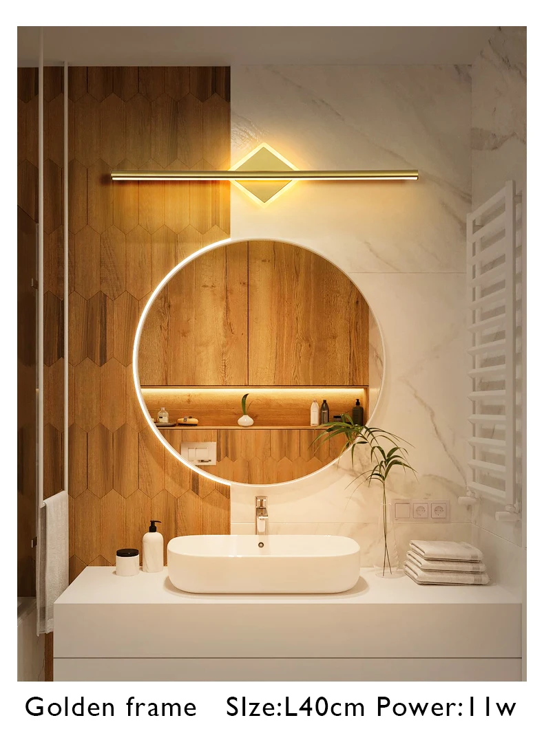Деталь продукта настенной лампы: Размер настенного светильника: L40 см мощность: 11 Вт Площадь: 3-5 квадратных метров L60 см Мощность: 14 Вт Площадь: 5-8 квадратных метров L80 см Мощность: 17 Вт Площадь: 5-10 квадратных метров Расстояние от стены: 10 см Зеркальный передний Светильник Цвет корпуса: белая оправа. Золотая оправа Прикроватный светильник: гостиная, спальня, столовая, кухня, ванная комната, зеркальный передний светильник Материал настенных светильников: абажур из ПВХ + металлический корпус Вход настенного светильника: AC110V 120V 220V 230V Светильник Bethroom цвет: теплый белый, холодный белый