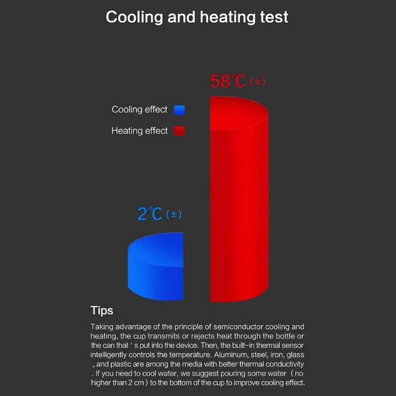 Нагрев и охлаждение-Держите ваш напиток прохладным или кофе горячим в течение 10 минут. Две кнопки нажатия, красный светодиодный светильник для горячего режима, нагревается до 140 °, синий для холодного режима, самый крутой при 21 °