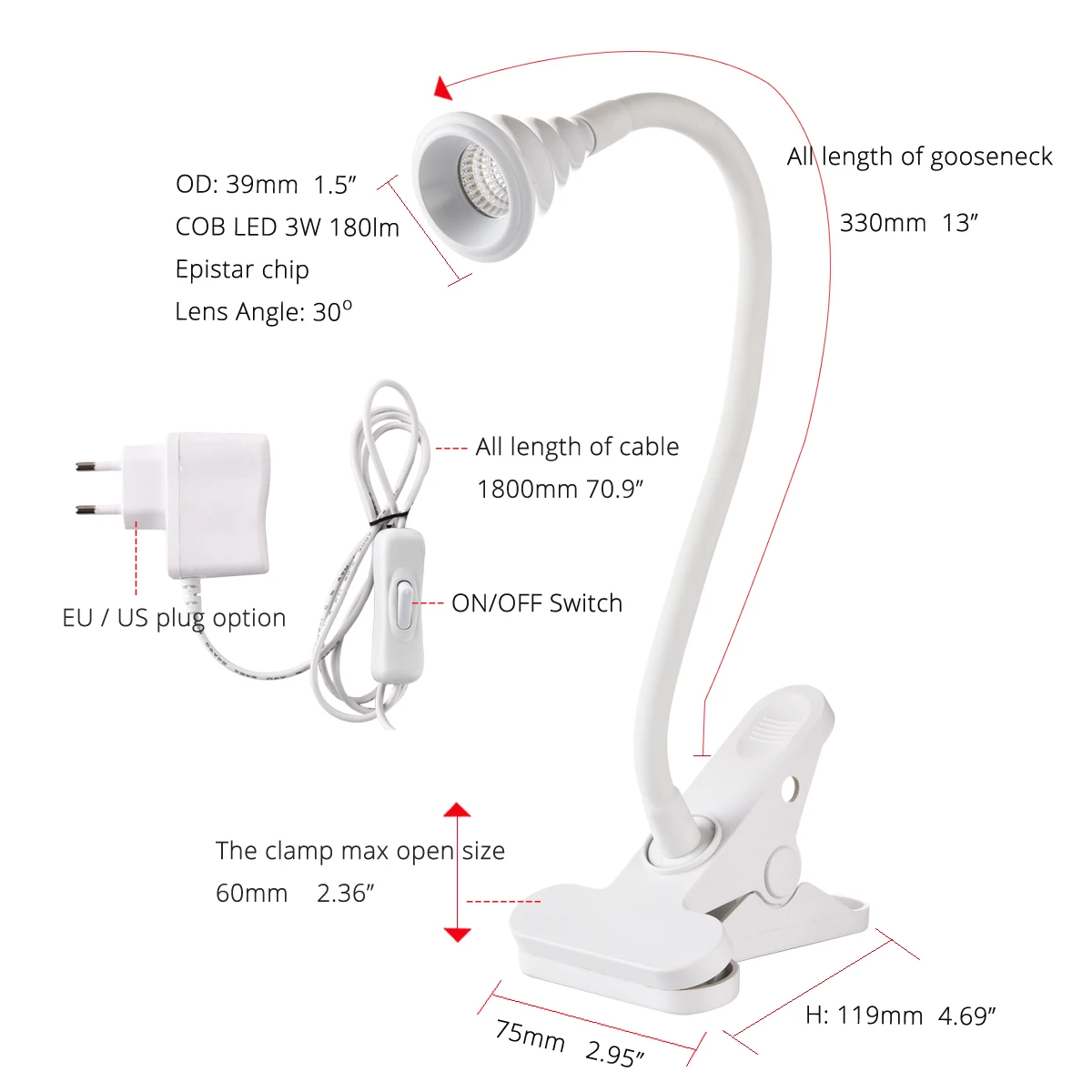 1 шт. 3 Вт зажим светильник (2 шт. винтовые фитинги, переключатель, вилка в комплекте) 4000K Настольная лампа
