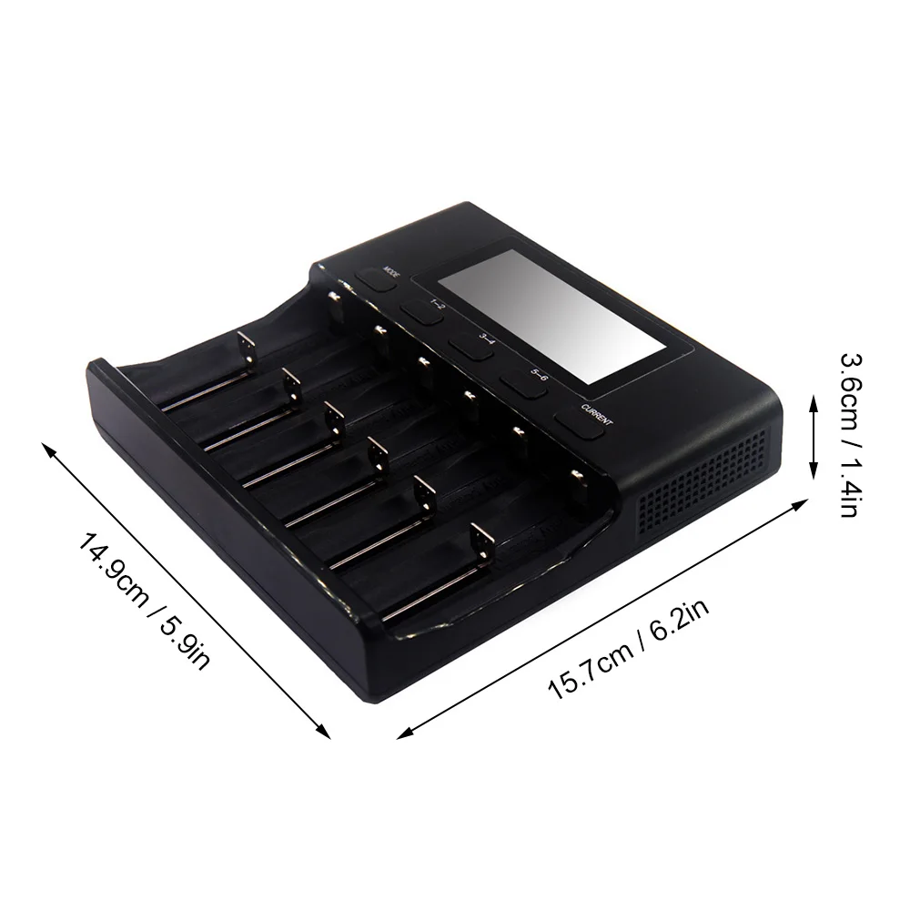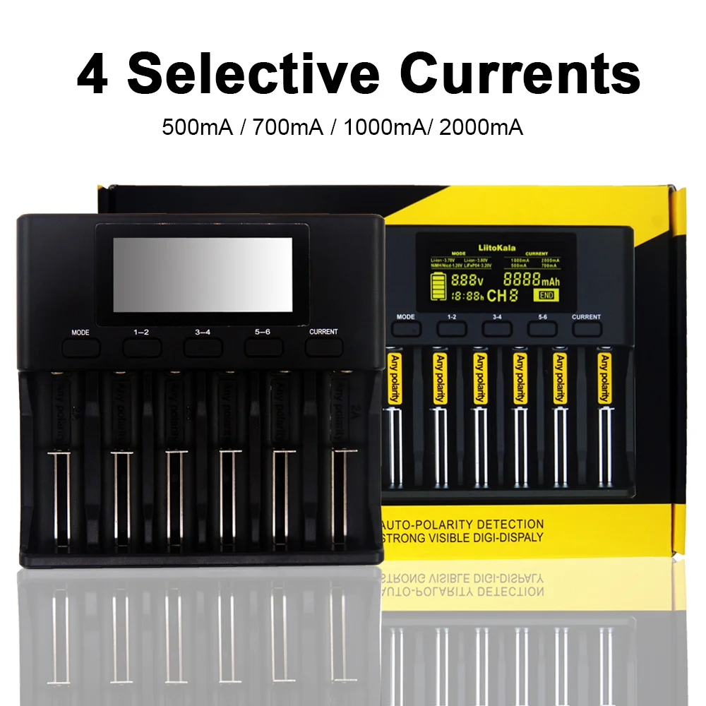 4 селективных тока: 500мА/700мА/1000мА/2000ма. Литий-ионный аккумулятор (3,70 в/3,80 В) / LiFePO4 (3,20 в)-2000ма в слоте 1/3/6 и 1000мА в слоте 2/4/5. Вы можете выбрать ток зарядки, нажав кнопку тока, но 2000 мА не может быть выбран для слота 2/4/5; По умолчанию ток зарядки NiMH / NiCd (1,20 В) фиксируется на 500 мА, И ток не может быть выбран.