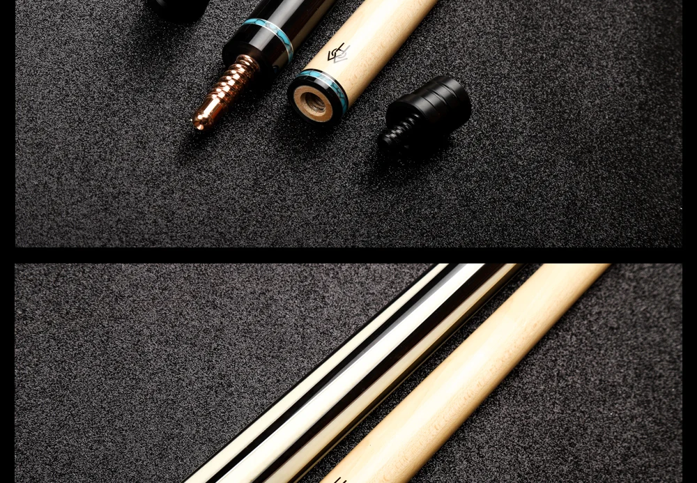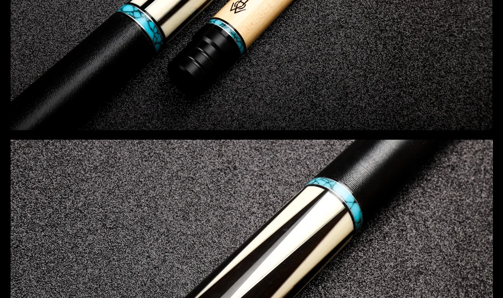 Детали модели: верхняя и нижняя восьмимечная модель на основе черного дерева. Это кий, в котором бирюзовое кольцо светится в профессиональной модели Rishi chic.
