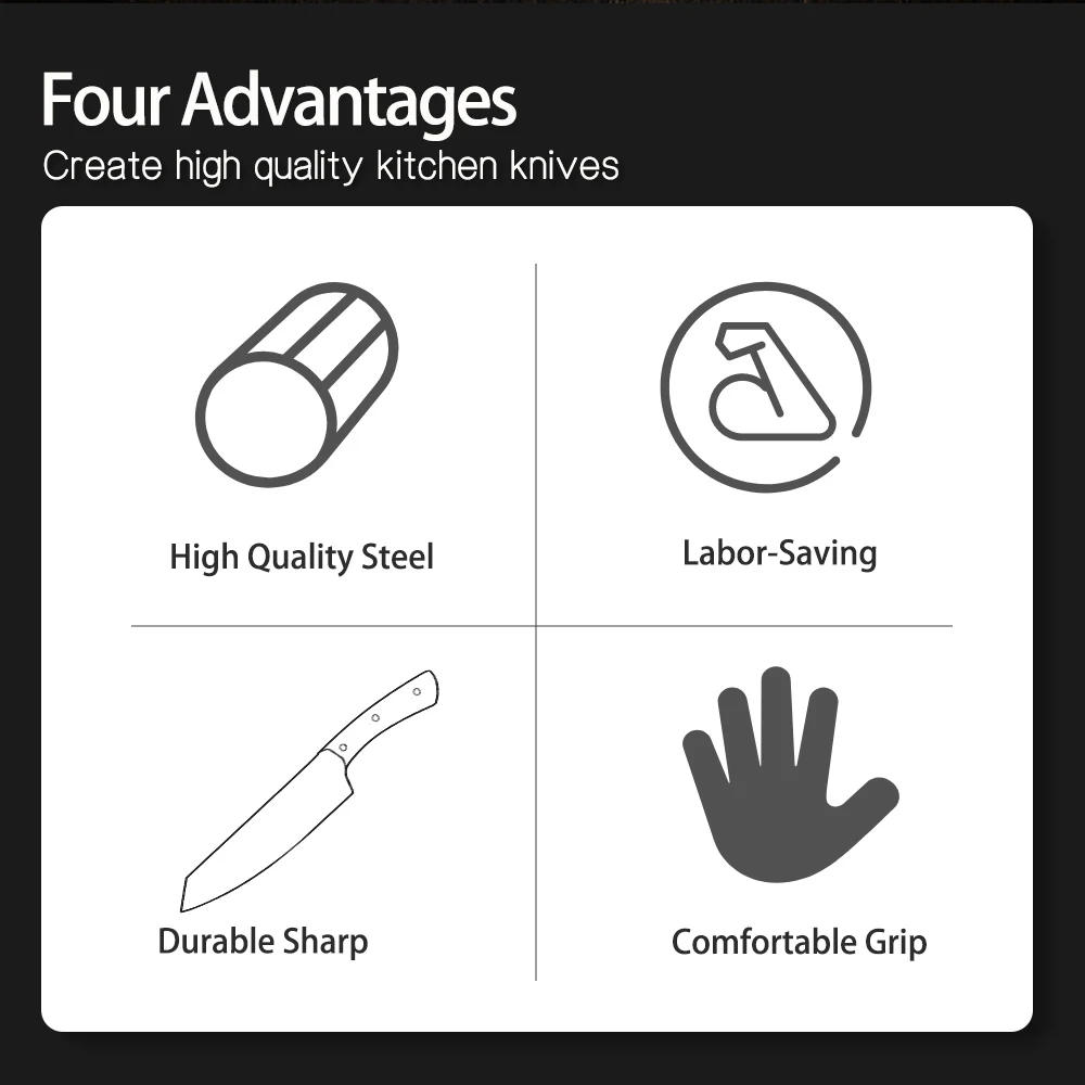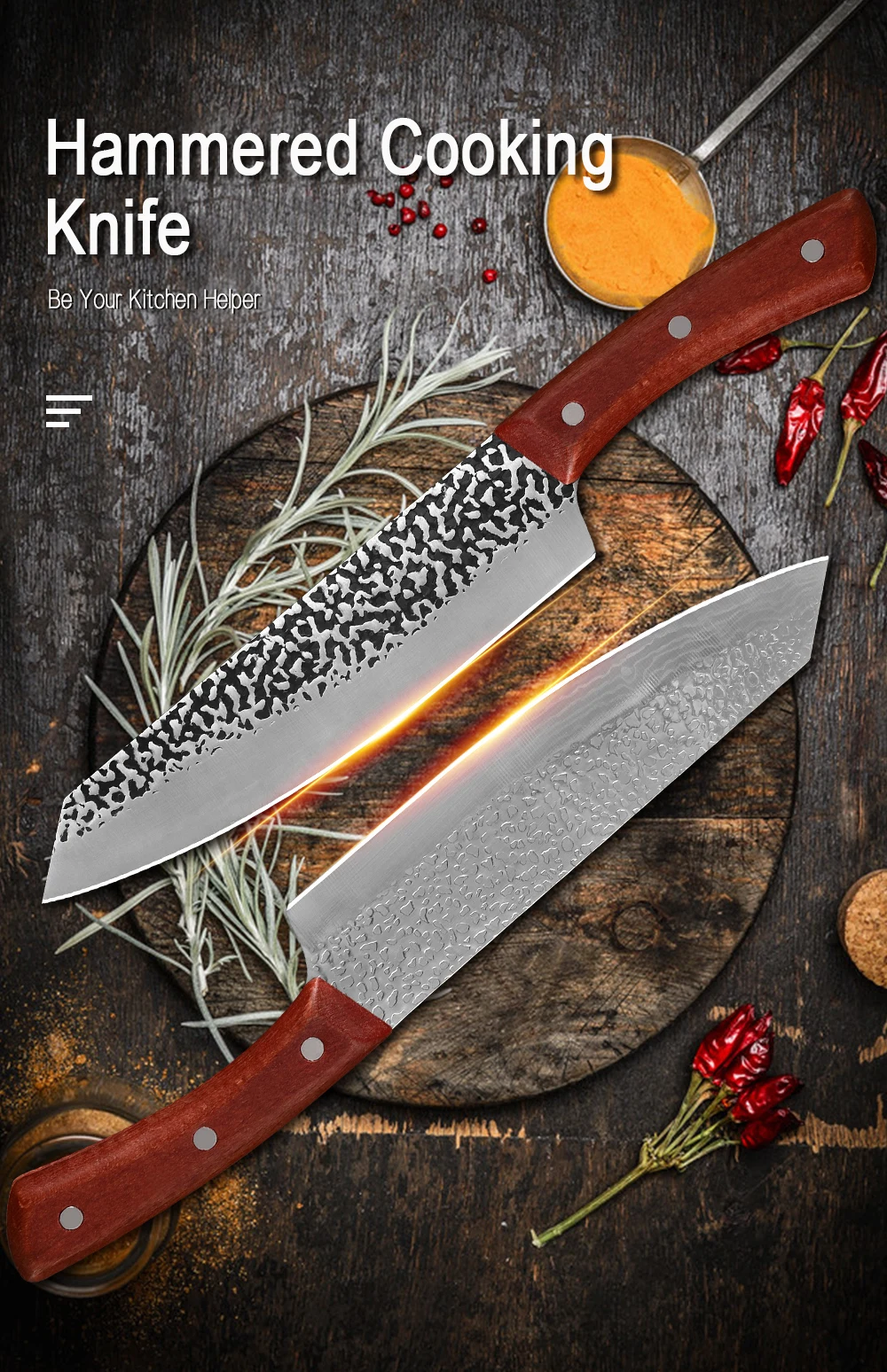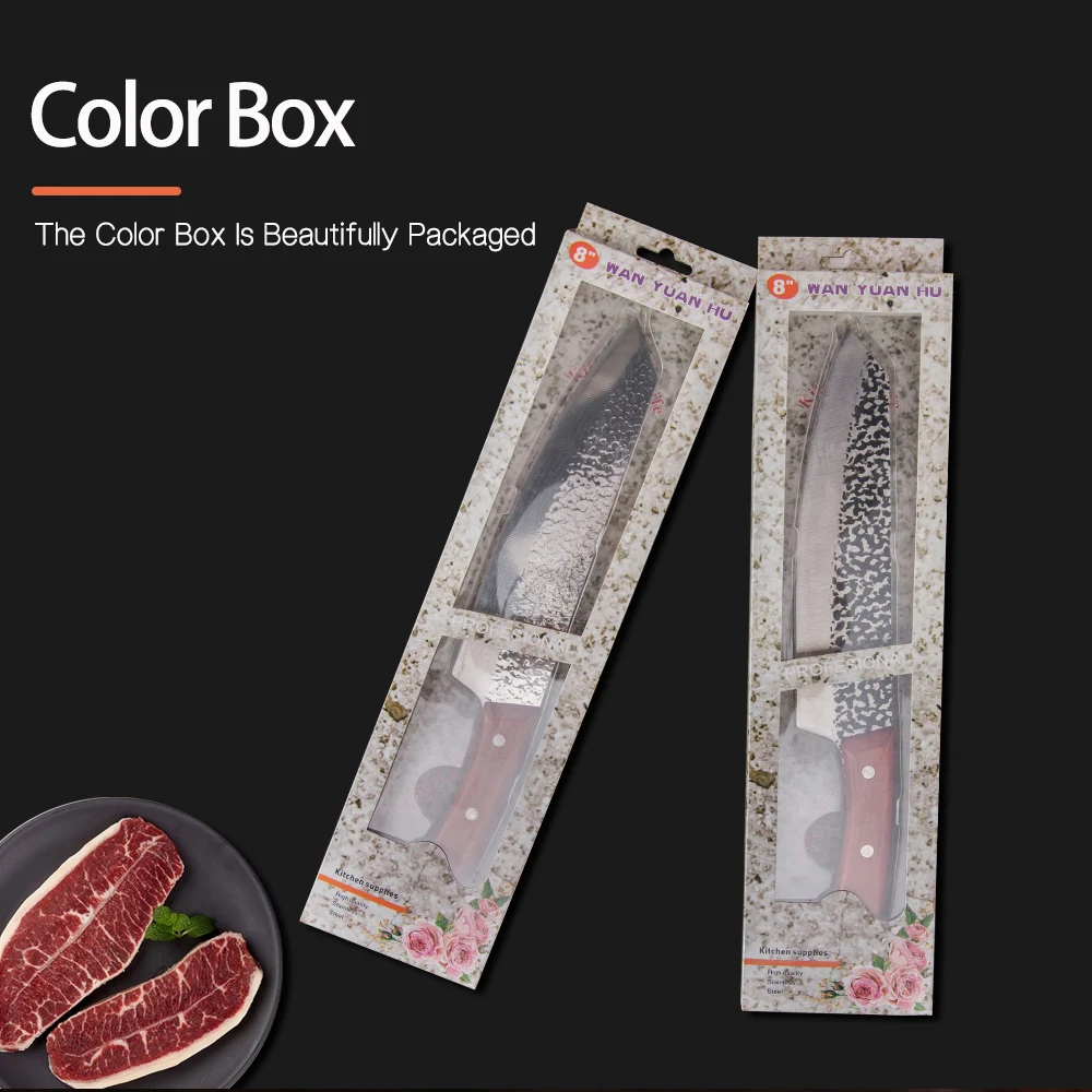 Размер ножа: 8 дюймов Вес ножа: около 170 г Толщина лезвия: 2 мм Материал: Кованая Высокоуглеродистая сталь ручной работы Закалка всплеск: 780 градусов Температура: 180 градусов-200 градусов Характеристики: бритва острая для легкой резки костей Ручка: полностью интегрированный Стальной хвостовик + дерево + заклепки Производственный процесс: в закалки-закалки молота-закалки-зажима стали-молота-закалки и других операций непрерывного цикла.