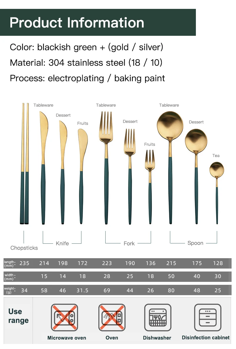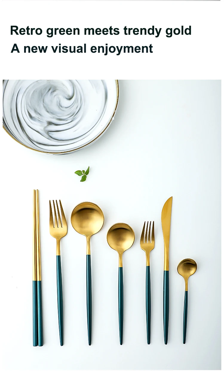 Пожалуйста, перейдите на страницу с информацией о размере! Черно-зеленый, ретро темно-зеленый, изысканный и гениальный. Изготовлен из нержавеющей стали 304, матовая поверхность, уникальная текстура, темно-зеленая ручка, простое и атмосферное золото, элегантный и очаровательный в использовании, изысканные контуры и различные стили, ежедневное использование или подарочные наборы довольно удивительны. Нержавеющая сталь 304: обладает высокой пластичностью и пластичностью, может формировать различные формы и может удовлетворить потребности различных пространств. Нержавеющая сталь 420: с высокой твердостью широко используется для изготовления деталей, устойчивых к атмосферной, паровой, водной и кислотной коррозии. Советы по техническому обслуживанию: 1: при появлении царапин Используйте ткань из люфы, смоченную в зубной пасте, и аккуратно протрите. 2: Не используйте твердые предметы при очистке, чтобы не заставить гальванический слой упасть и не поцарапать.