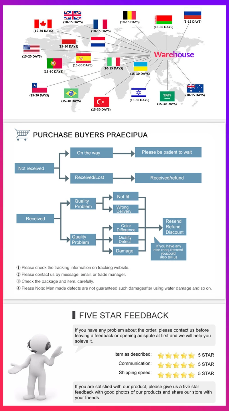 Часто задаваемые вопросы В: есть ли скидка на крупные заказы? О: если вы размещаете большой заказ у нас в течение определенного периода времени, мы отправим товары вместе и предоставим Вам скидку. В: Поддерживаете ли вы другие варианты доставки? О: Да, мы предоставляем Почта Китая обычных малых пакетов Plus, Cainiao Super Economy, ePacket, AliExpress стандартную доставку и Почта Китая заказной авиапочтой В: все фотографии реальны? Ответ: Конечно, все наши изображения сделаны на 100% нашими фотографами В: Поддерживаете ли вы прямую поставку? О: Да, мы поддерживаем прямую поставку. Вам нужно только подтвердить информацию В: почему доставка такая медленная? О: на самом деле, это не так быстро, как DHL fedex, потому что все наши товары имеют низкую маржу и бесплатную доставку для большинства стран, что, если честно, является убытком для некоторых стран, но я считаю, что доставка не медленная и может отслеживать, куда идет информация. Отгрузка 1. После оплаты, из-за складских запасов и разницы во времени, мы выберем отправку ваших товаров с нашего первого доступного склада для быстрой доставки, мы тщательно подготовим товары для вас в течение 1-5 дней. Вообще говоря, время доставки составляет около 5-60 дней, а для кораблей из отдаленных или слаборазвитых стран еще дольше. 2. Мы осуществляем доставку только по подтвержденному адресу заказа. Ваш адрес заказа должен совпадать с адресом доставки. 3. Время доставки услуги должно быть предоставлено перевозчиком, за исключением выходных и праздничных дней. Время доставки может меняться, особенно во время праздников. 4. Информация об отслеживании будет предоставлена в течение 2-5 дней после отправки (информация об отслеживании в некоторых случаях бесплатной логистики отсутствует). Если вы все еще не получили товары, когда срок доставки подходит к концу, пожалуйста, свяжитесь с нами, чтобы продлить дату доставки для вас. 5. Если вы не получили товары в течение 60 дней после оплаты, пожалуйста, свяжитесь с нами. Мы Отследим отправку и свяжемся с Вами как можно скорее. Наша цель – удовлетворение клиентов! Возврат средств 1. При получении товара, если вы обнаружите любую проблему с товаром, пожалуйста, немедленно свяжитесь с нами и предоставьте нам достаточно доказательств. (Совет: при вскрытии посылка записывайте незапечатанное видео.) Если товар действительно поврежден, пожалуйста, сделайте фото и отправьте его на нашу электронную почту или онлайн-чат, чтобы связаться с нами. Мы предоставим Вам решения или компенсацию. 2. У вас есть 7 дней, чтобы связаться с нами и вернуть товар через 15 дней после получения. Если у вас есть товар более 7 дней, вы рассмотрите его использование, и мы не предоставим вам возврат или замену. 3. Все возвращаемые товары должны быть в оригинапосылка вке, и вы должны предоставить нам номер отслеживания доставки, конкретную причину возврата и идентификатор вашего заказа. 4. После получения первоначального состояния и упаковки ваших возвращенных товаров со всеми компонентами и аксессуарами мы вернем вам полную сумму покупки. 5. Если товар прибудет к вам, и вы его не получите, он будет возвращен нам. После получения товара мы вернем или повторно отправим его вам по запросу (вы будете нести ответственность за возврат и почтовый сбор). Отзывы Отзывы 1. Если вы удовлетворены нашими товарами, Мы будем признательны за отзы