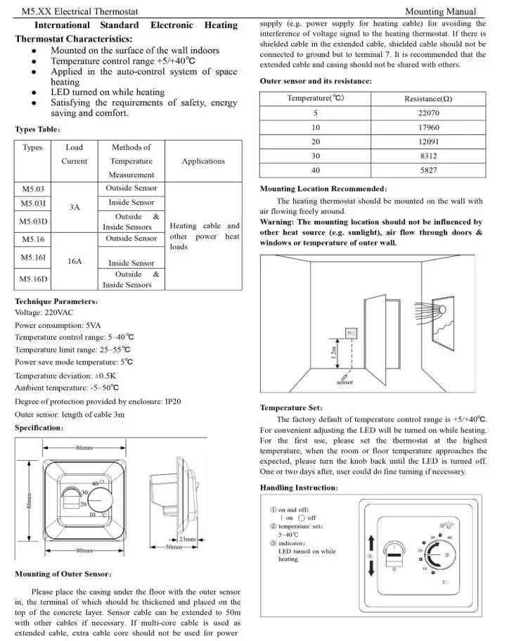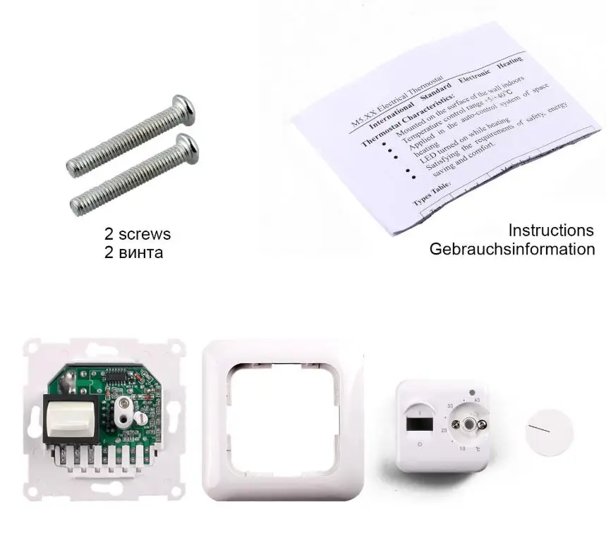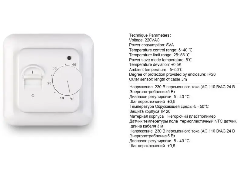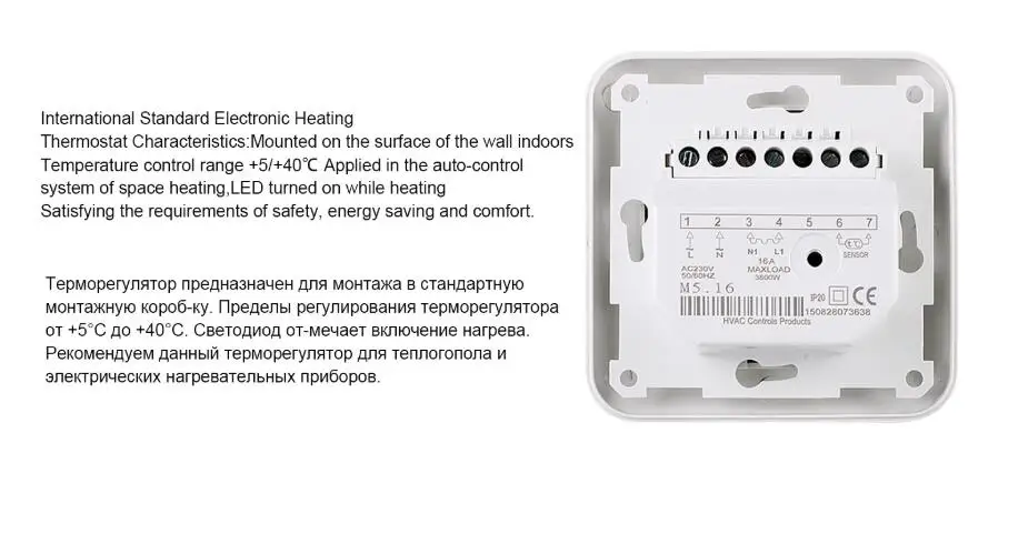 Термостат принимает комнатную температуру со встроенным датчиком или датчиком пола, и нагревательный контакт закроется, когда комнатная температура опускается ниже выбранной точки.