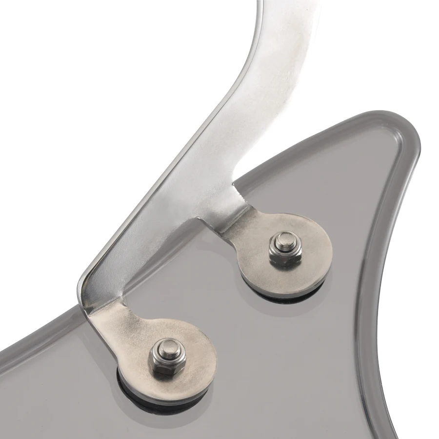Темный поликарбонатный экран крепится к вилочным трубам с хромированными регулируемыми зажимами