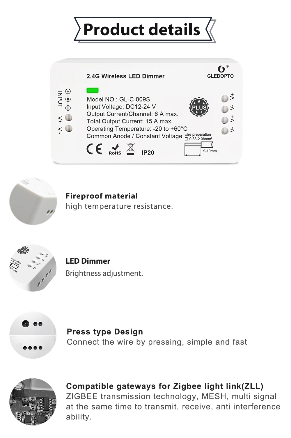 Название продукта: контроллер полосы ZIGBEE PlusНомер модели: GL-C-009SНапряжение: DC12V-24VВыход: Макс. 6А/канал, общий выход макс.15a