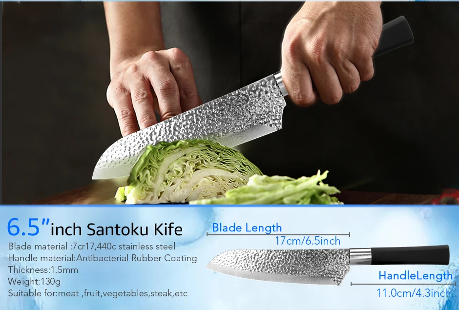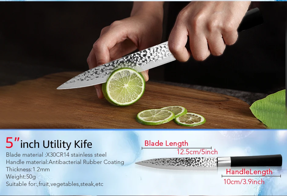 1. Материал лезвия: X50CrMov15 высокоуглеродистая Нержавеющая сталь 2. Твердость лезвия: 56- 58 HRC 3. Поверхность лезвия: Черное антипригарное окислительное покрытие, без ржавчины! 4. Материал ручки: Высококачественная Нескользящая ручка ABS + мягкое покрытие TPR * Примечание: Каждый нож имеет защитную пластиковую крышку ножа *