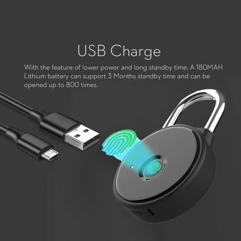 The USB rechargeable 300MAH lithium battery can support up to one year of standby time on a single charge (the number of unlocks is 5000). When the battery is dead, the fingerprint padlock will remain locked.