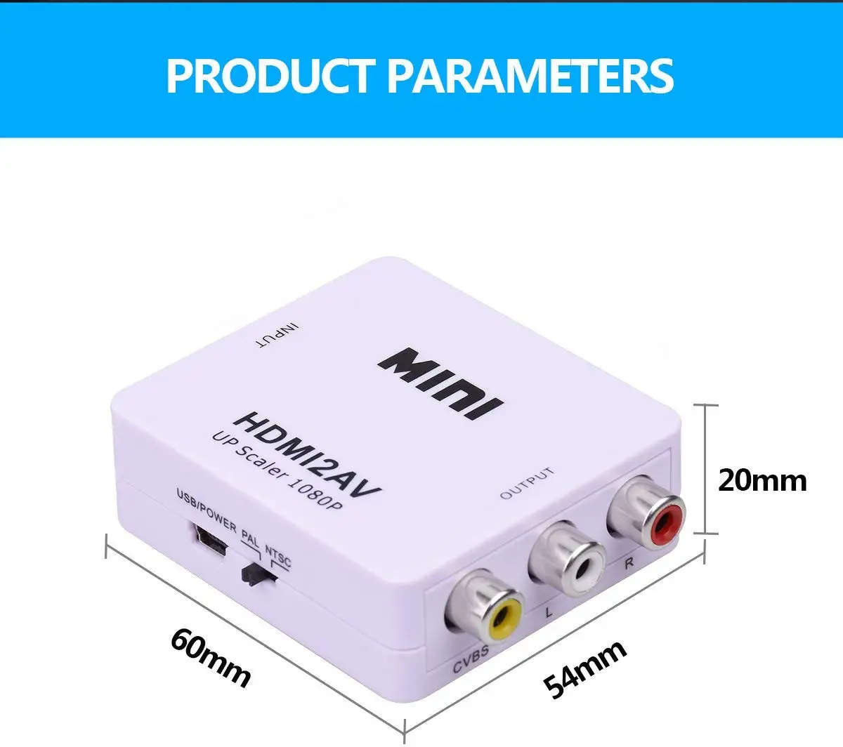 Он преобразует качественный HDMI видео сигнал в обычный CVBS сигнал (стандартное разрешение 480i,576i), для устройств, таких как TV, VHS видеомагнитофон, DVD рекордеры и т. Д., которые поддерживают NTSC и PAL.