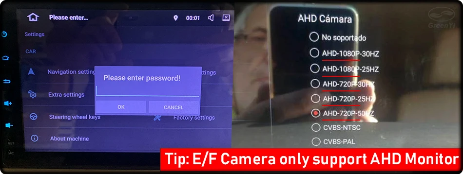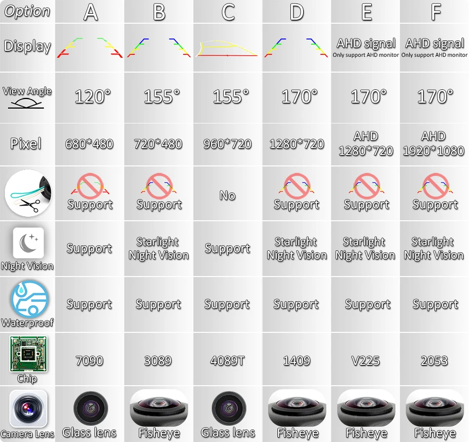 О параметрах E, F, AHD камера поддерживает только AHD монитор и новое автомобильное радио Android. Перед покупкой, пожалуйста, проверьте Android устройство поддержки AHD видео сигнала!