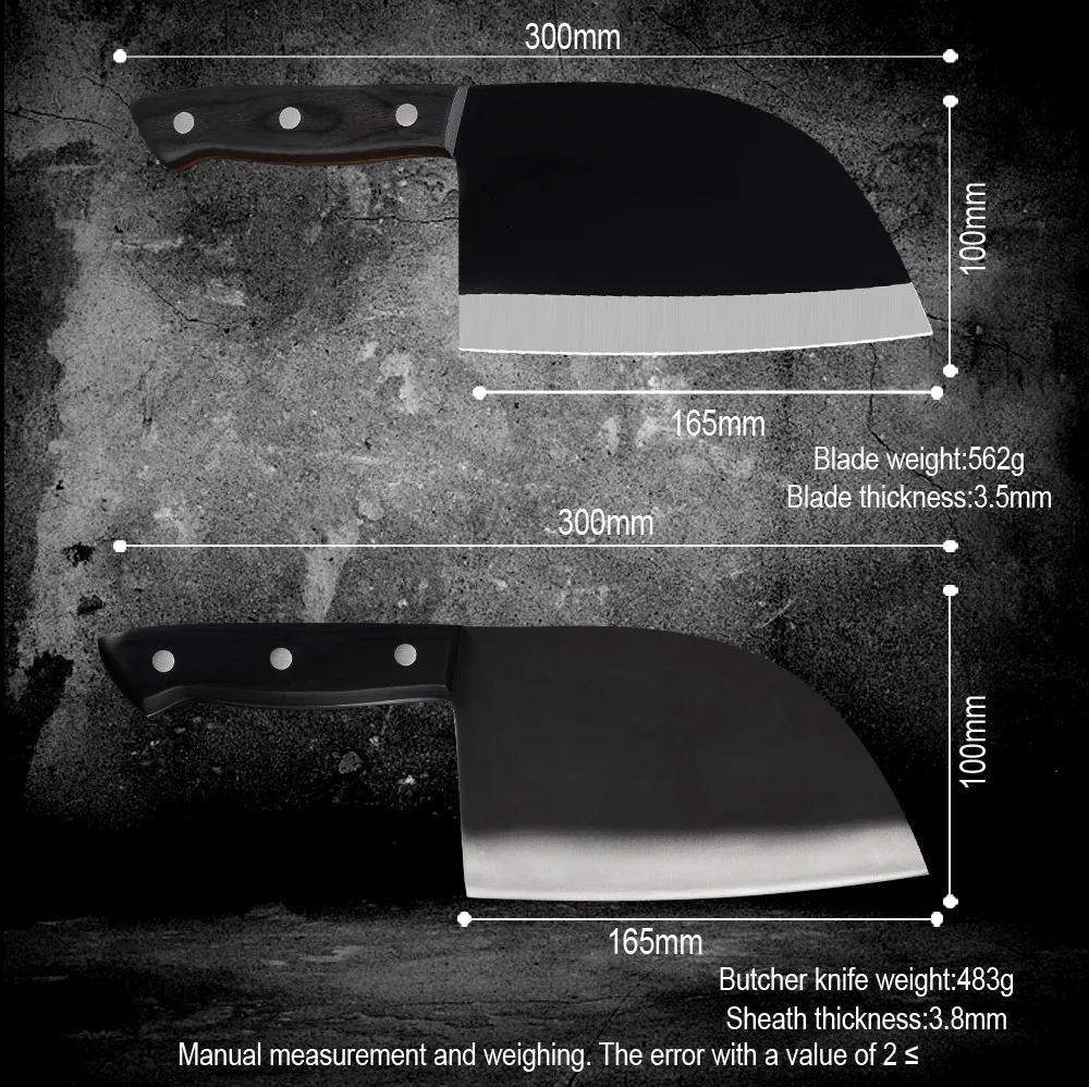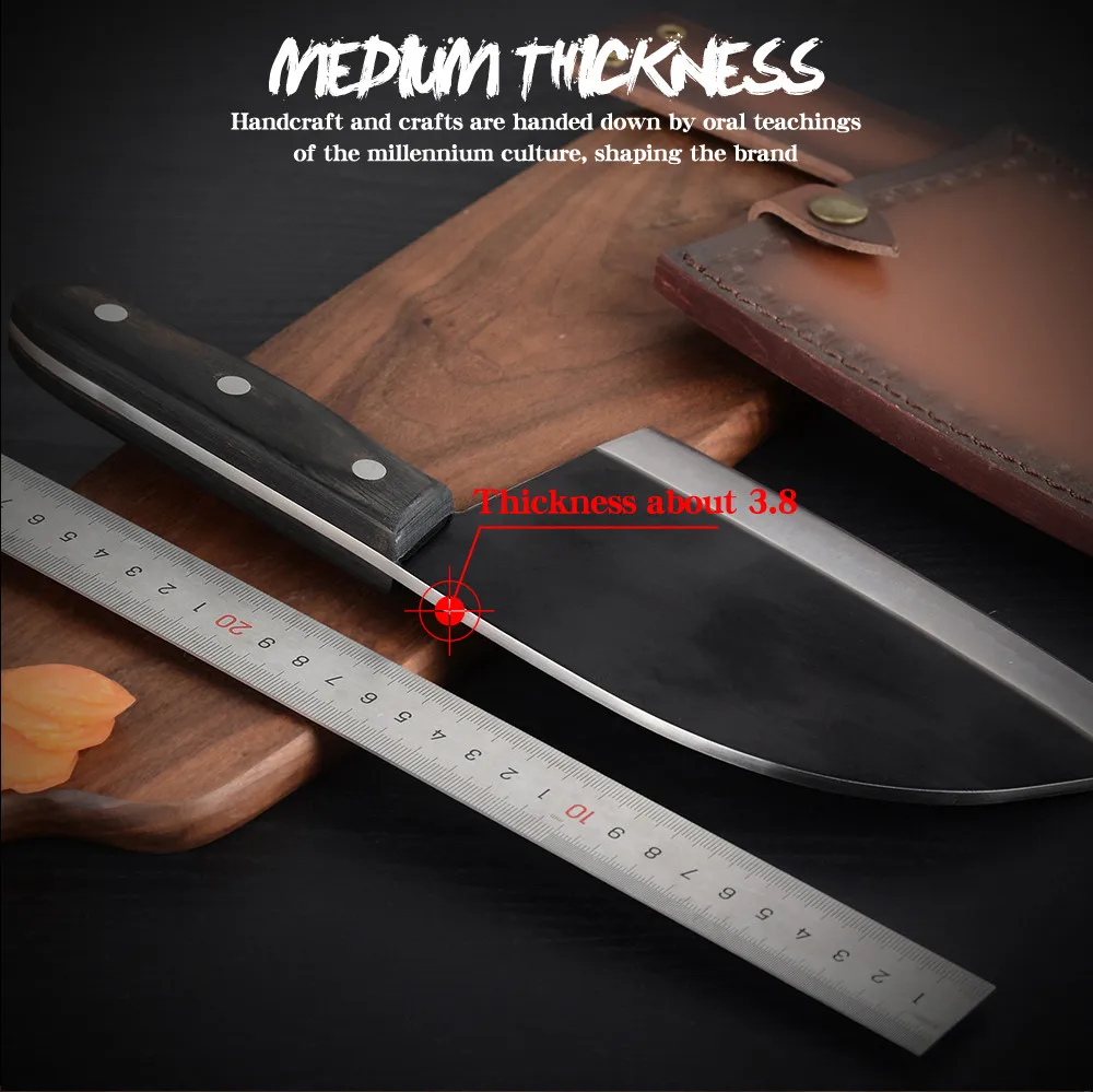 Нож шеф-повара мясника поставляется с оболочкой для защиты вашего ножа и может быть прикреплен к поясу для удобной переноски при использовании на открытом воздухе. (Может быть запах кожаной оболочки, пожалуйста, Повесьте в проветриваемом месте в течение нескольких дней, когда вы получите его.)