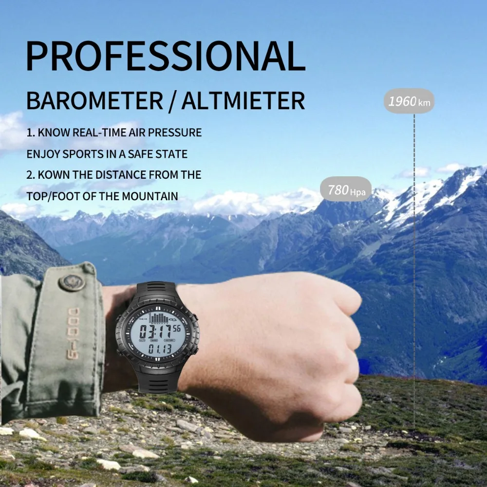 Функция: Высотомер Барометр Цифровой обратный подшипник Термометр Прогноз погоды Chime Секундомер Обратный отсчет Ежедневная сигнализация Pacer Двойное время Настройка ЖК-дисплея Час/Минц/месяц/дата/неделя Формат 12/24 часов Единица измерения давления воздуха/высоты/температуры Подсветка EL Водонепроницаемость 30 м.