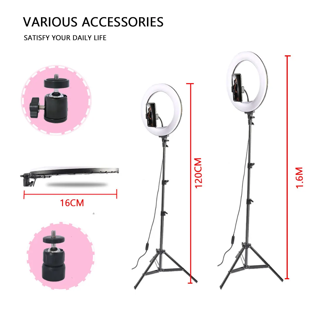 Набор 4: кольцевой светильник 16 см, кронштейн 120 см, пластиковая головка, зажим для телефона