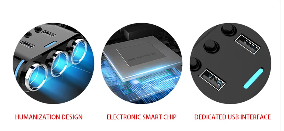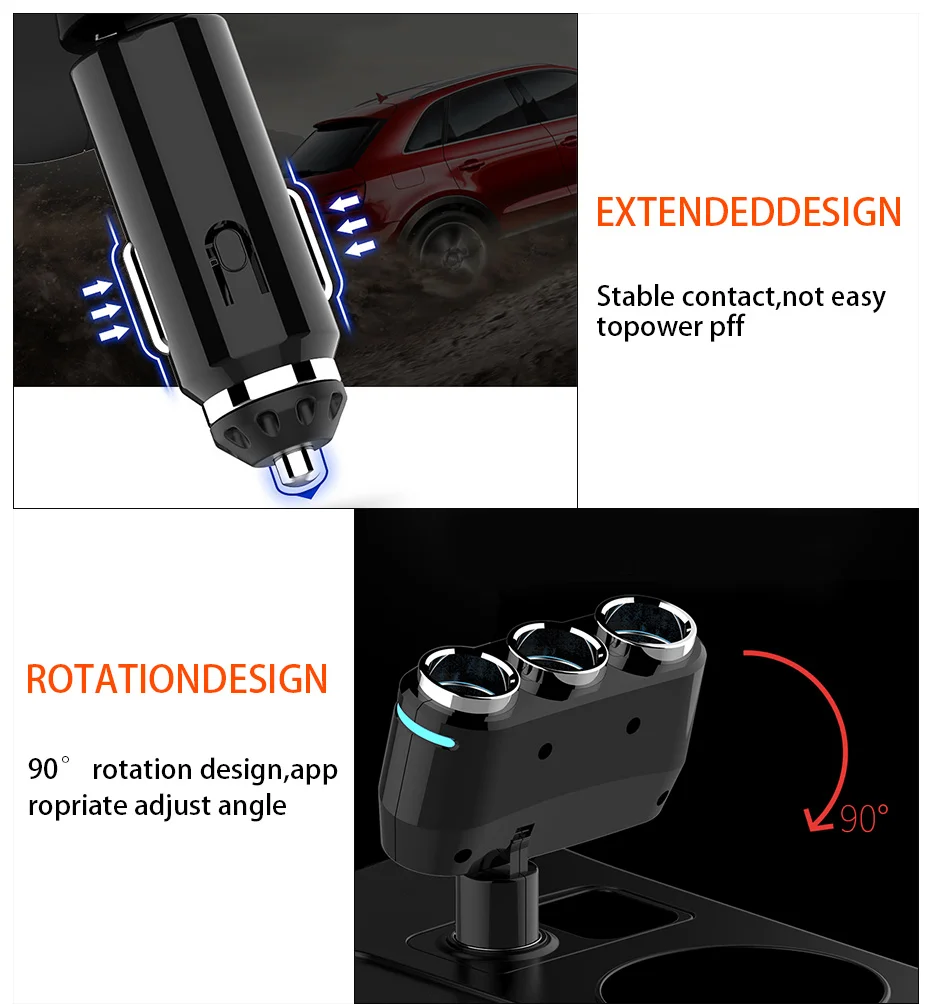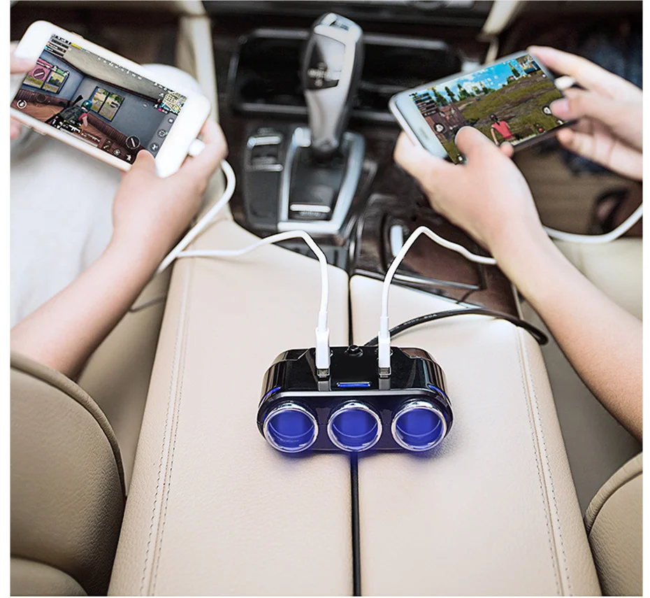 Прикуриватель имеет 3 гнезда для прикуривателя и 2 usb-порта для зарядки. Он поддерживает одновременную зарядку нескольких устройств, удобно и быстро. Он также имеет защиту от перенапряжения и перегрузки по току, безопасность