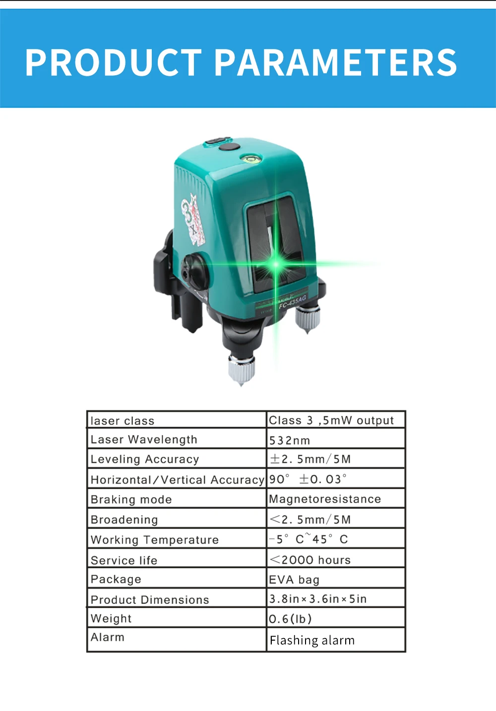 1. Длина волны: 635 нм/зеленая линия, 2. Точность: ± 2 мм/5 м 3. Ширина линии: 2 мм 4. Предупреждение о дисбалансе: мигающий сигнал 5. Температура: 5-45 ℃ 6. Светильник источник: полупроводник 7. Стабильное время балансировки: < 5S 8. Диапазон автоматического выравнивания: ± 3 ° 9. Лазерный угол: 90 ° ± 30 10. Мощность: 2 × 1,5 V AA батарея (не в том числе) 11. Рабочее расстояние: 10 ~ 30 м 12. Мощность лазера: 4,5 ~ 6 мВт