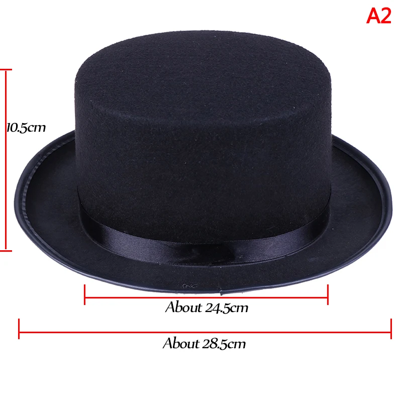 - Material: Polyester Felt - Color: Black - One size fits most adult - It includes one black satin top hat as shown in the picture. A great hat for any theatrical plays or musicals! Size Chart: Outside: 30.5 x 25.5 x 12cm Inside: 20.5 x 17 x 12 cm Inner cap circumference: 56-58cm