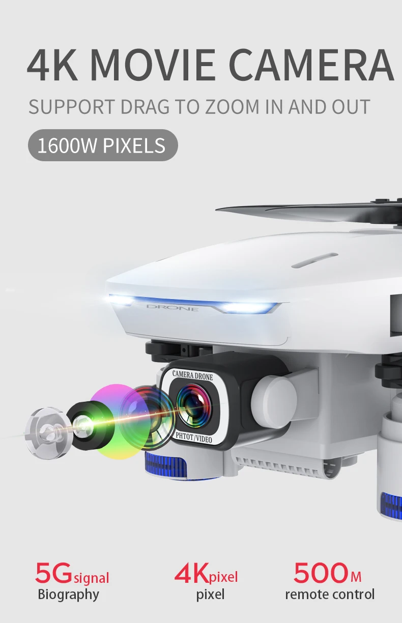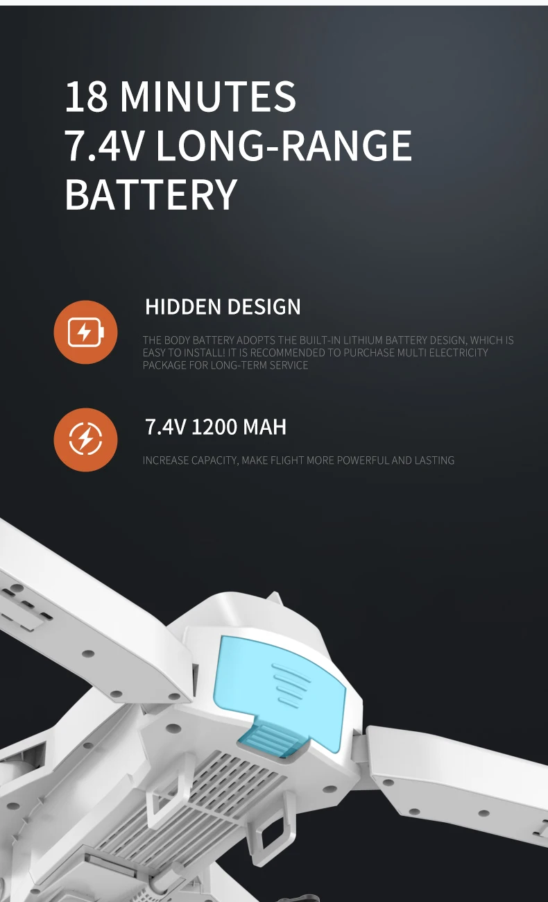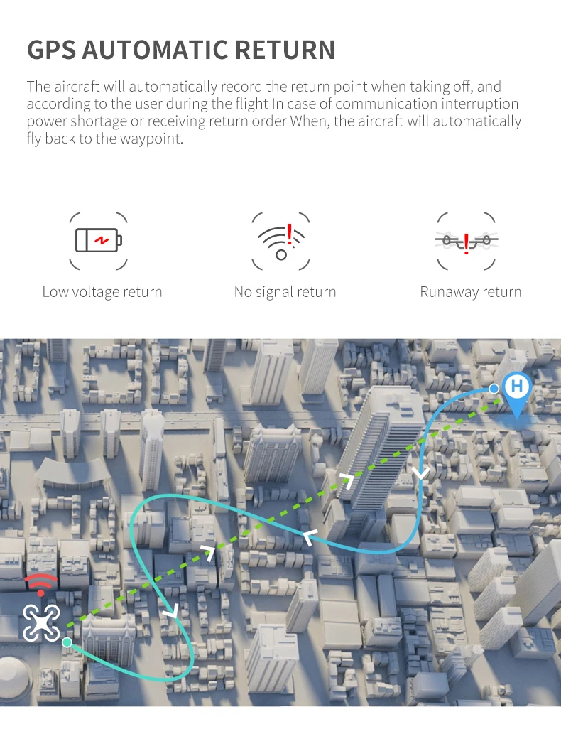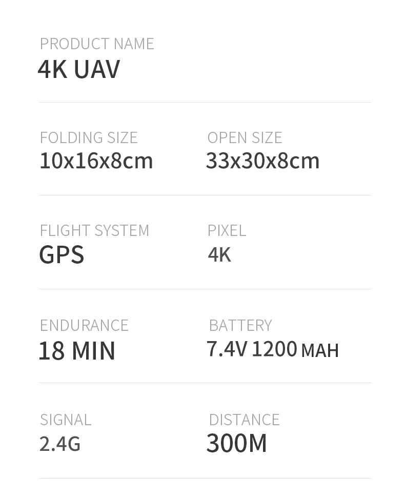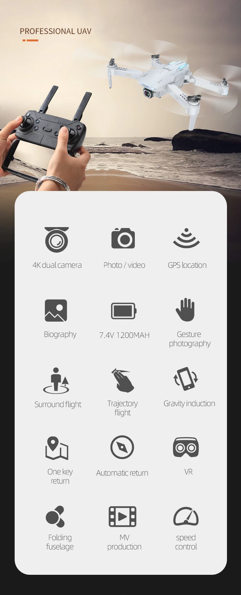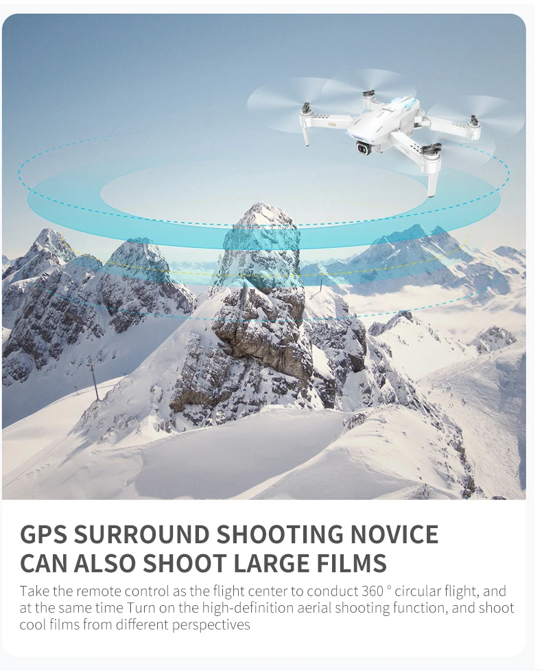 -С складной ручкой, маленький размер, легко носить с собой. -Режим позиционирования GPS может обеспечить более точный полет. -С функцией Wi-Fi 5G/2,4G, можно подключить к приложению, системе APK, чтобы делать фотографии/видео, передавать изображения в режиме реального времени через мобильный телефон-камеру -5G Wi-Fi fpv расстояние до 250 м. -Опционально 2,4G WiFi 1080P/2,4G WiFi 4K HD / 5G WiFi 4K HD камера может обеспечить различные изображения и видео высокой четкости. -Следуйте за мной: самолет будет контролировать Телефон и следовать направлению движения оператора. -С функцией режима удержания высоты, он может обеспечить стабильный полет. -Объемное движение сделает самолет лететь кругами, тем самым обеспечивая более холодный угол съемки. -Режим полета Waypoint, просто нарисуйте маршрут на экране и используйте вертолет в качестве заданного пути. -Использование 7,4 V 1200mAh литий-ионная аккумуляторная батарея, время полета составляет до 20 минут. -Безголовый режим, не нужно регулировать положение самолета перед полетом. -Функция возврата одним нажатием кнопки, вы можете легко найти свой путь домой. -Взлет/посадка одним щелчком. Одним нажатием кнопки взлета или посадки автоматически, Дрон будет снимать или возвращать в положение взлета. -Защита от перегрузки по току при низкой мощности. -Анти-помех использует 2,4 ГГц технологии. -4 канала, могут двигаться вверх, вниз, вперед, назад, влево, вправо. -Шестиосевой гироскоп для более стабильного полета и более легкого управления. -Он имеет 3 уровня переключения скорости полета, чтобы сделать полет более веселым. -Четырехроторный фюзеляж изготовлен из высокопрочного, высокопрочного инженерного пластика, который является светильник и долговечным. Функции: вверх/вниз, вперед/назад, поворот влево/вправо, влево/вправо, боковая f светильник, 3 уровня f светильник скорости, светодиодный светильник, GPS позиционирования, follow me (следуй за мной), летать, путевой f светильник, режим обслуживания высоты, Безголовый режим, возврат одной кнопкой, Взлет/посадка одной кнопкой, WiFi FPV, камера/видео
