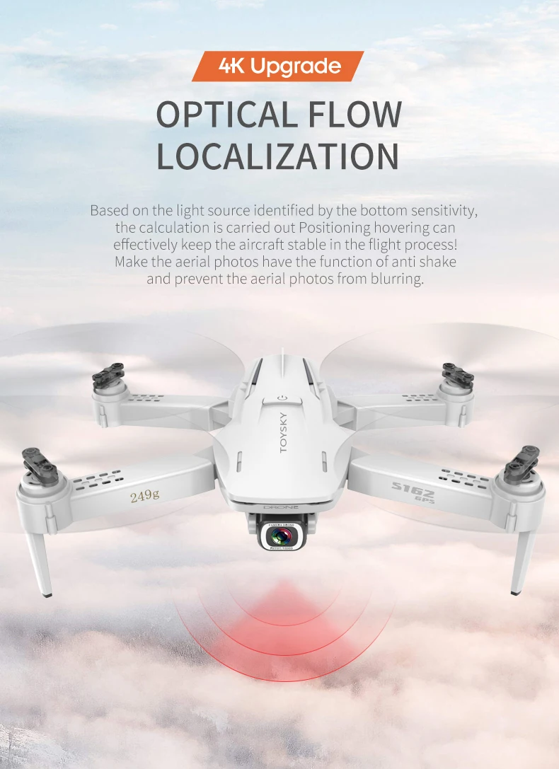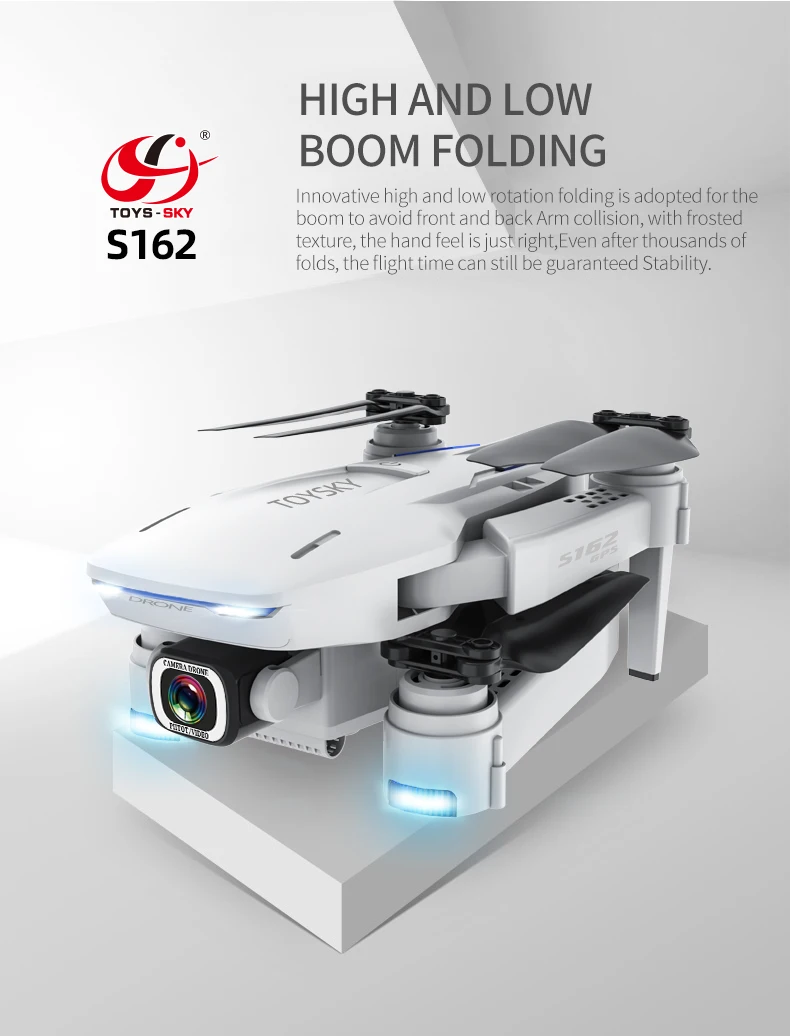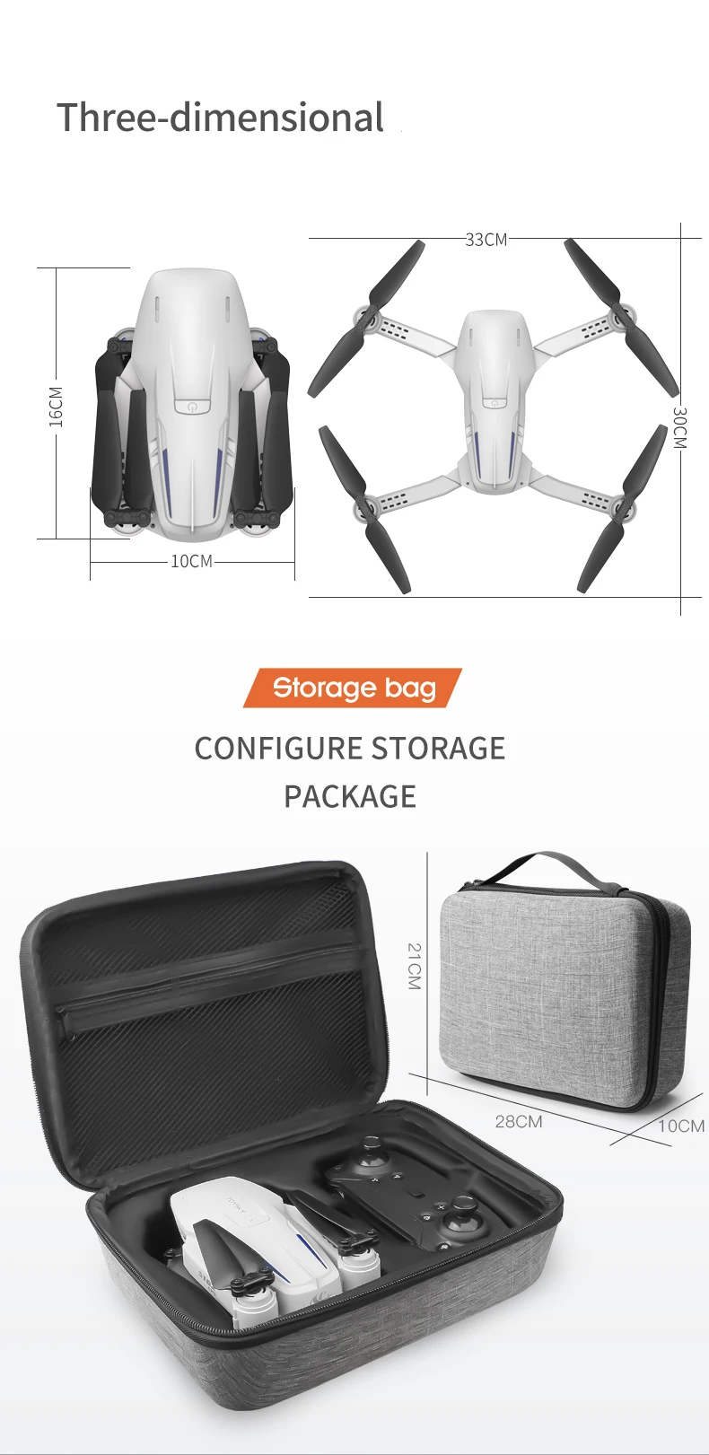 Номер детали: S162 Частота: 2,4G / 5G Канал: 4CH Ось G: 6 осей Батарея: 7,4 V 1200 мА/ч, литий-ионный аккумулятор Батарея (все указанные аккумуляторы входят в комплект поставки) Батарея передатчика: 4x1,5 батарейки типа AAA (не прилагаются) Время полета: 18-20 минут Время зарядки: 150-180 минут Расстояние дистанционного управления: 300-500 м Вес полета: 241,9 г (включая батарею) Белый цвет Камера дополнительно: 2,4G WIFI 1080P/2,4G WiFi 4K HD / 5G WiFi 4K HD Поле зрения: 120 ° Широкий угол 1080P пикселей: Изображение: 1920*1080 (сохранить на мобильный телефон) Видео: 1920*1080 (сохранить на телефоне) 4K пикселей: Изображение: 3840*2160 Видео: 3840*1080 APK: (поддерживает IOS 6 или выше и Android 4,4 или высококлассные системы) Четырехсторонний Размер: Размер складывания изделия (см): 16*10*7,5 Размер продукта (см): 33*30*7,5 Размер упаковки (см): 28*21*10