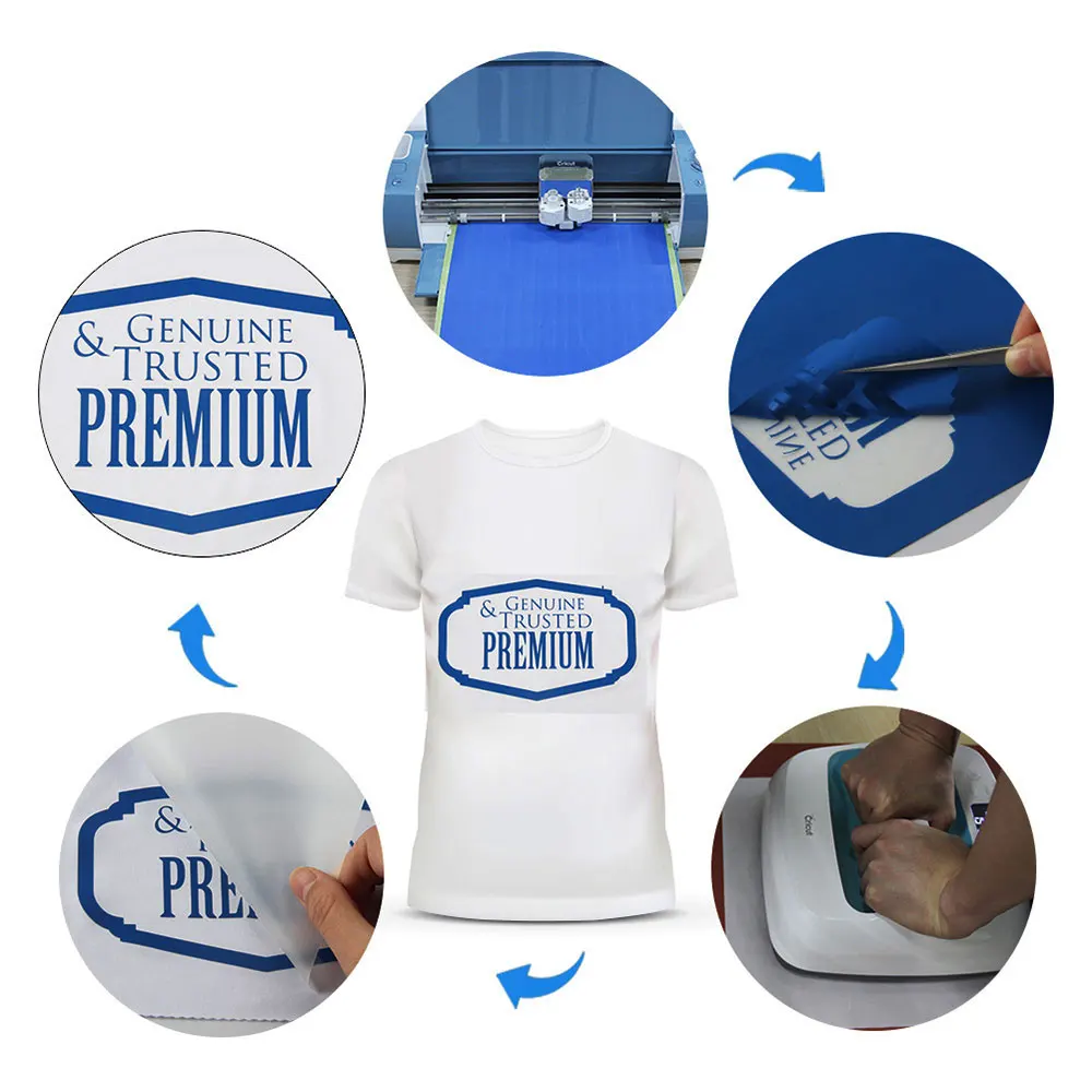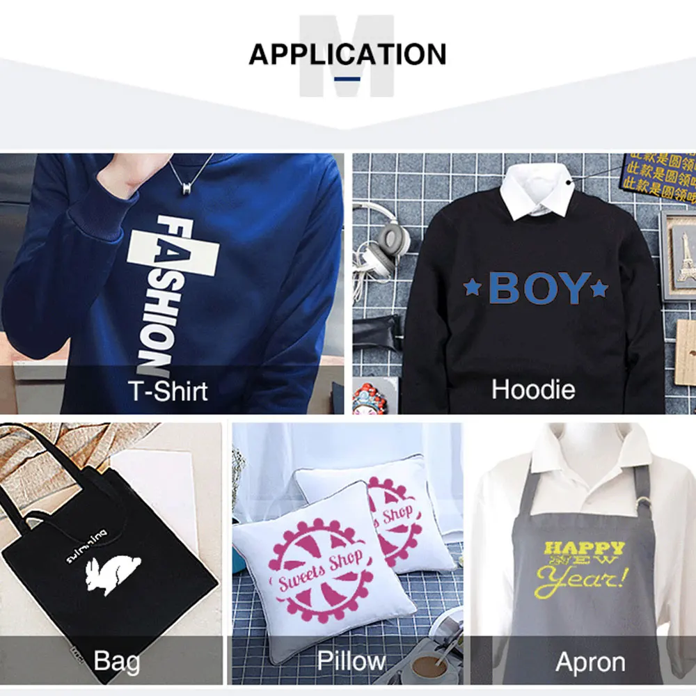 Подходит для широкого спектра тканей, таких как хлопок, полиэстер, вискоза, вискоза и хлопок/полиэстер, надпись, монограмма, нумерация и логотипы для футболок, обуви, фартуков, бейсболки для автомобиля и другие предметы одежды, которые требуют прочного htv винила.