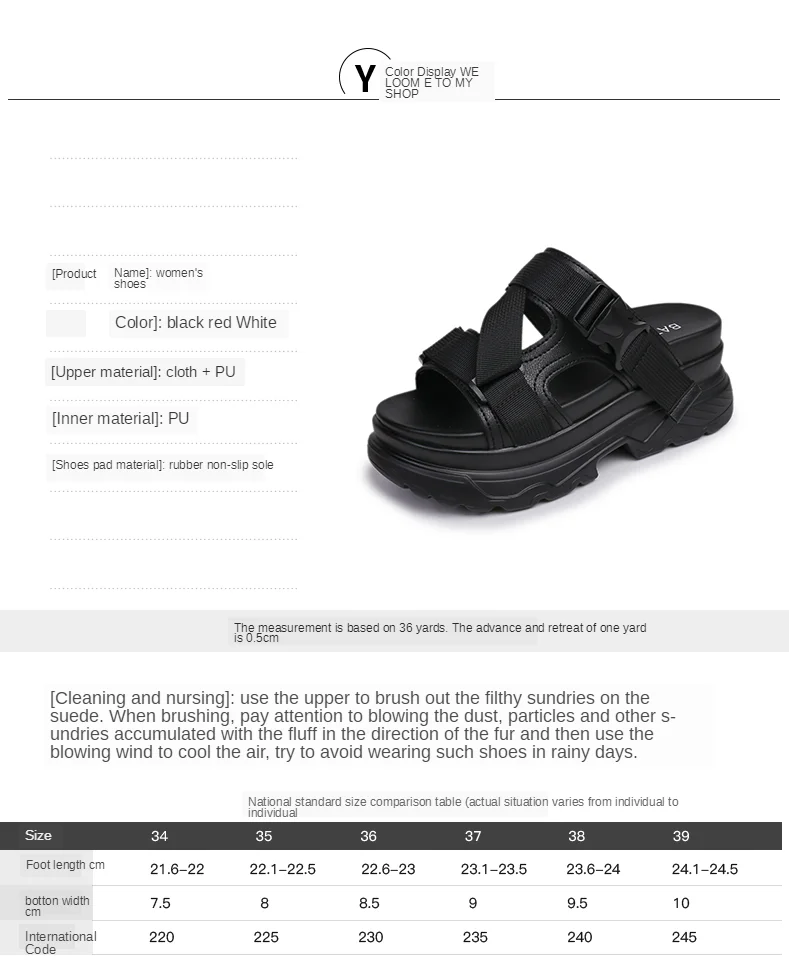 Описание продукта различных размеров, в том числе внутренняя длина обуви, высота и цвет.