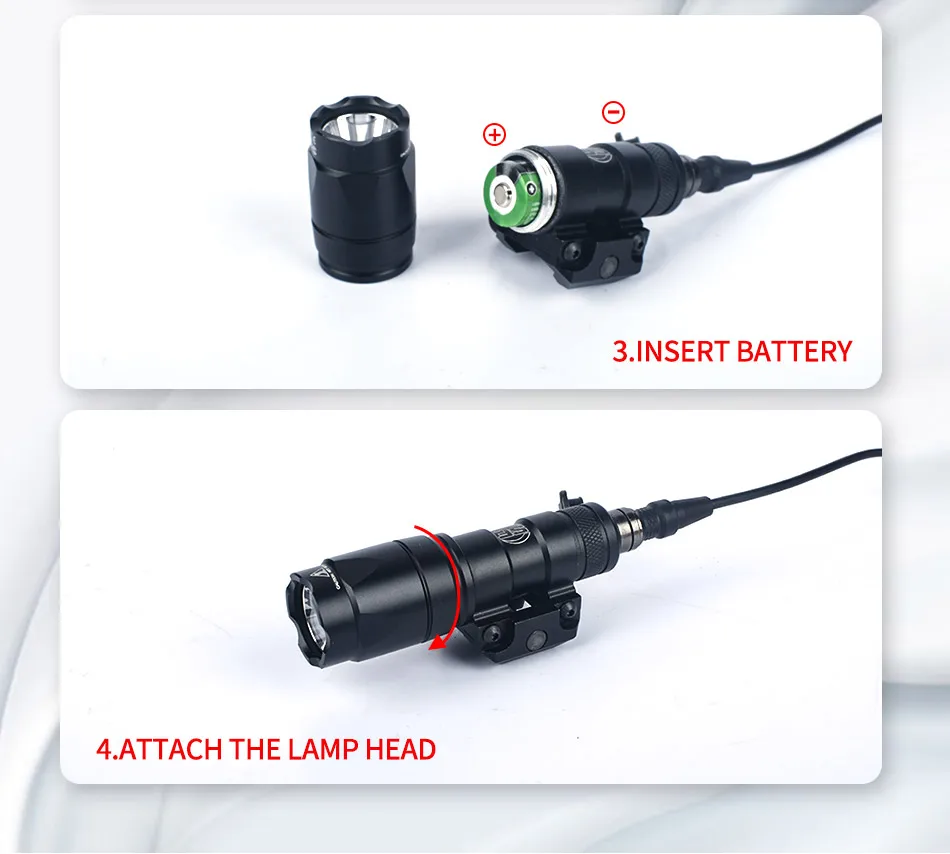 Пожалуйста, установите 1 * CR123A (3,0 V) батареи (не входят в комплект) 1. Вращающаяся головка лампы 2. Откройте батарейный отсек 3. Вставьте аккумулятор 4. Прикрепите головку лампы
