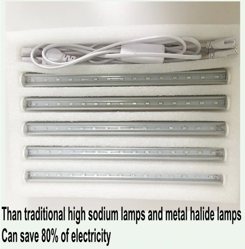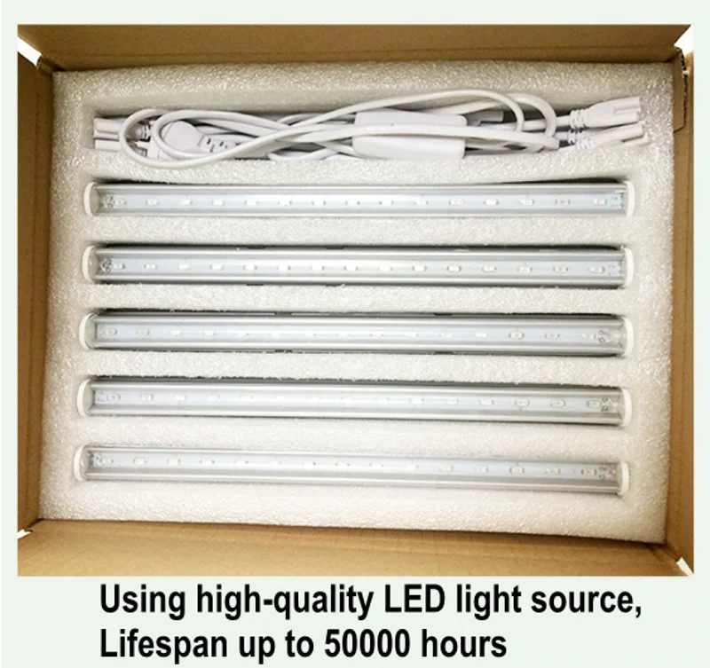 Описание товара:Суперяркий SMD5730 светодиодный, высокая интенсивность и надежность.Цвет излучения: 11 красный + 4 синий Каждая трубка (15 светодиодов)Рабочее напряжение: AC85-265VУгол обзора: 120 °Длина волны: Красный 660нм; Синий 460нмМодель вилки: штепсельная вилка EU / US / AU / UK Применение:Растительная тканевая культура, растительное культивирование, садоводство и промышленная система поддержки саженцев и аэрокосмической экологической жизни. Принцип:Светильник для выращивания растений является важным и незаменимым фактором в физической среде, благодаря регулировке качества светильник, контроль за морфогенезом растений является важной областью методов выращивания.Согласно фотосинтезу растений нужен светильник, мы будем растить светильник s в основном сделаны из комбинации красного и синего, все синие, все красные в трех формах, покрывая Диапазон длины волны, необходимый для фотосинтеза.Визуальный эффект, сочетание красного и синего светло-розового цветов растений.Красный светильник способствует прорастанию растительного производства, цветению; Blu-Ray может повысить хлоропласты деятельности по продвижению фотосинтеза растений. Упаковка:5 шт. x T5 трубка для выращивания1 шт. x 1,5 м ЕС/США штекер провода4 шт. x 30 см соединительный кабель4 шт. x установка компонентов
