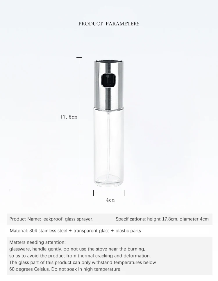 Особенности: Высококачественное качество-изготовлено из высококачественной нержавеющей стали и стекла, без BPA и экологически чистые, 100% степень безопасности пищевых продуктов. Умный дизайн прозрачного стеклянного горшка, вы можете легко сказать количество оставшейся жидкости. Многофункциональные -- идеальные кухонные принадлежности для дома и кухни. Заполните этот распылитель с вашими любимыми маслами, подсолнечным маслом, уксусом, соевым соусом, соком лимона и лайма, вином Шерри или марсала. И широко используется для приготовления салатов, приготовления пищи, выпечки, обжига, гриля, жарки, барбекю и так далее Простота в использовании: распылитель масла объемом 100 мл, просто нажмите на насос для распыления тонкого, ровного и равномерного тумана, точно Контролируйте количество приправ (Уксусное масло для соуса вина), когда Наслаждайтесь приготовлением удовольствия. Простота в использовании и очистке-простое насосное действие, которое производит тонкий туман, более равномерное распыление и контроль количества масла в раз, используемое при приготовлении пищи, после использования, можно отвинтить крышку и краску с помощью моющего средства или теплой воды Характеристики: Материал: нержавеющая сталь + бессвинцовое стекло Цвет: прозрачный Размеры: высота: около 17,5 см, диаметр основания: около 4 см Емкость: 100 мл Вес: около 240 г Посылка включает в себя: 1 шт. пустая бутылка-спрей