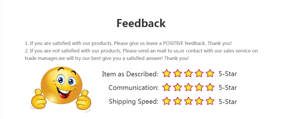 Ваши отзывы очень важны для нас. Пожалуйста, оставьте положительные отзывы и 5 звезд, если вы удовлетворены нашими товарами и услугами.